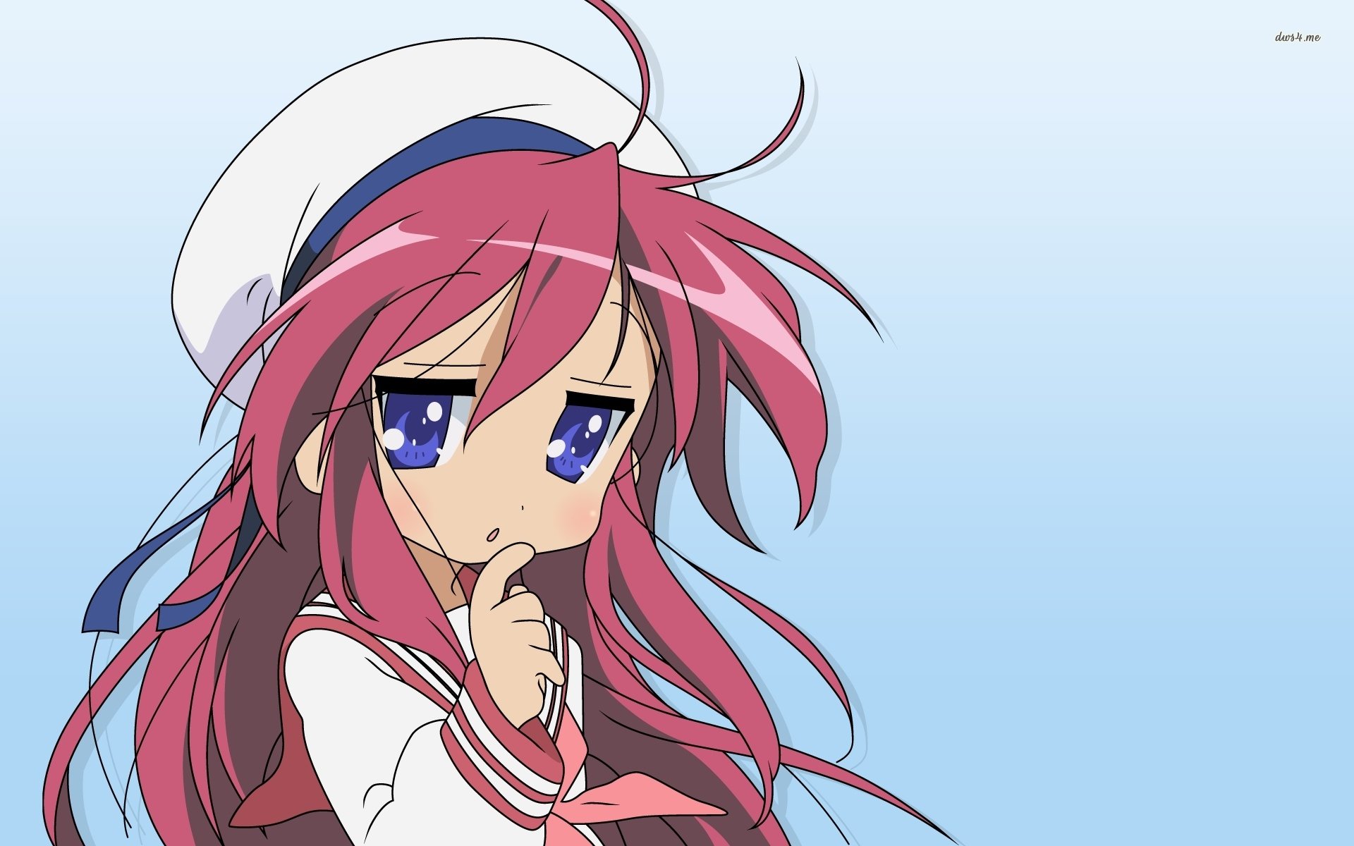 Description: A girl with pink hair and blue eyes wearing a sailor hat and a sailor outfit with a sailor's knot.