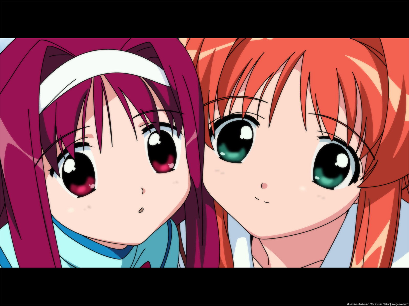 Description: Two anime girls with pink hair and green eyes looking at the camera with a sad look on their face.