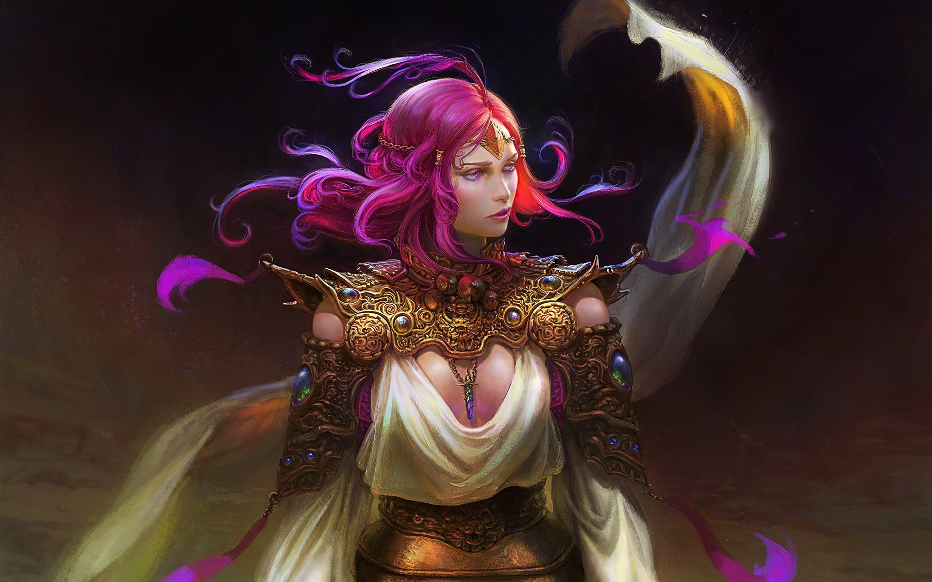 Description: A woman with pink hair and a white dress holding a sword and a gold vase with a white bird on it.