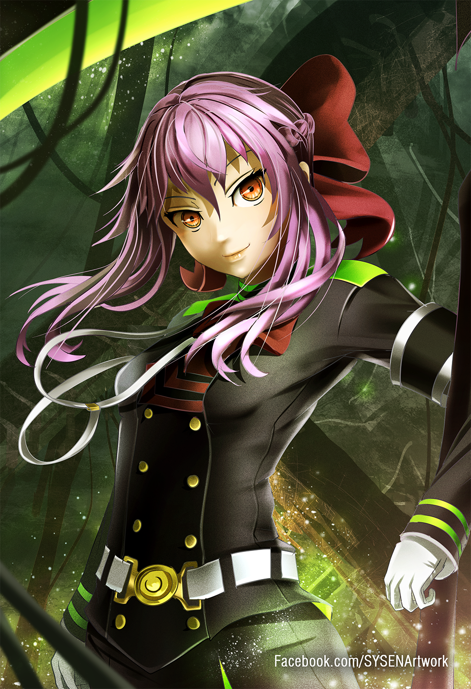 Description: A anime character with long pink hair and a green hat and a green and black outfit and a green and yellow background.
