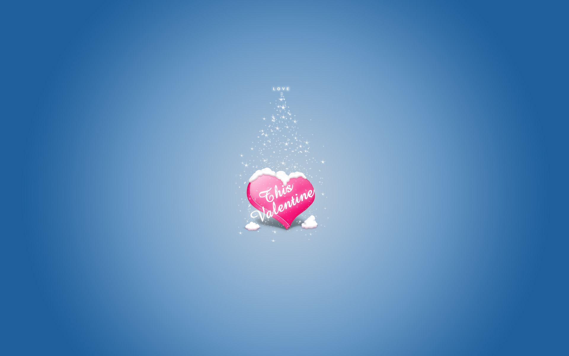 Description: A pink heart with a message on it floating in the air with snow around it and a blue background.