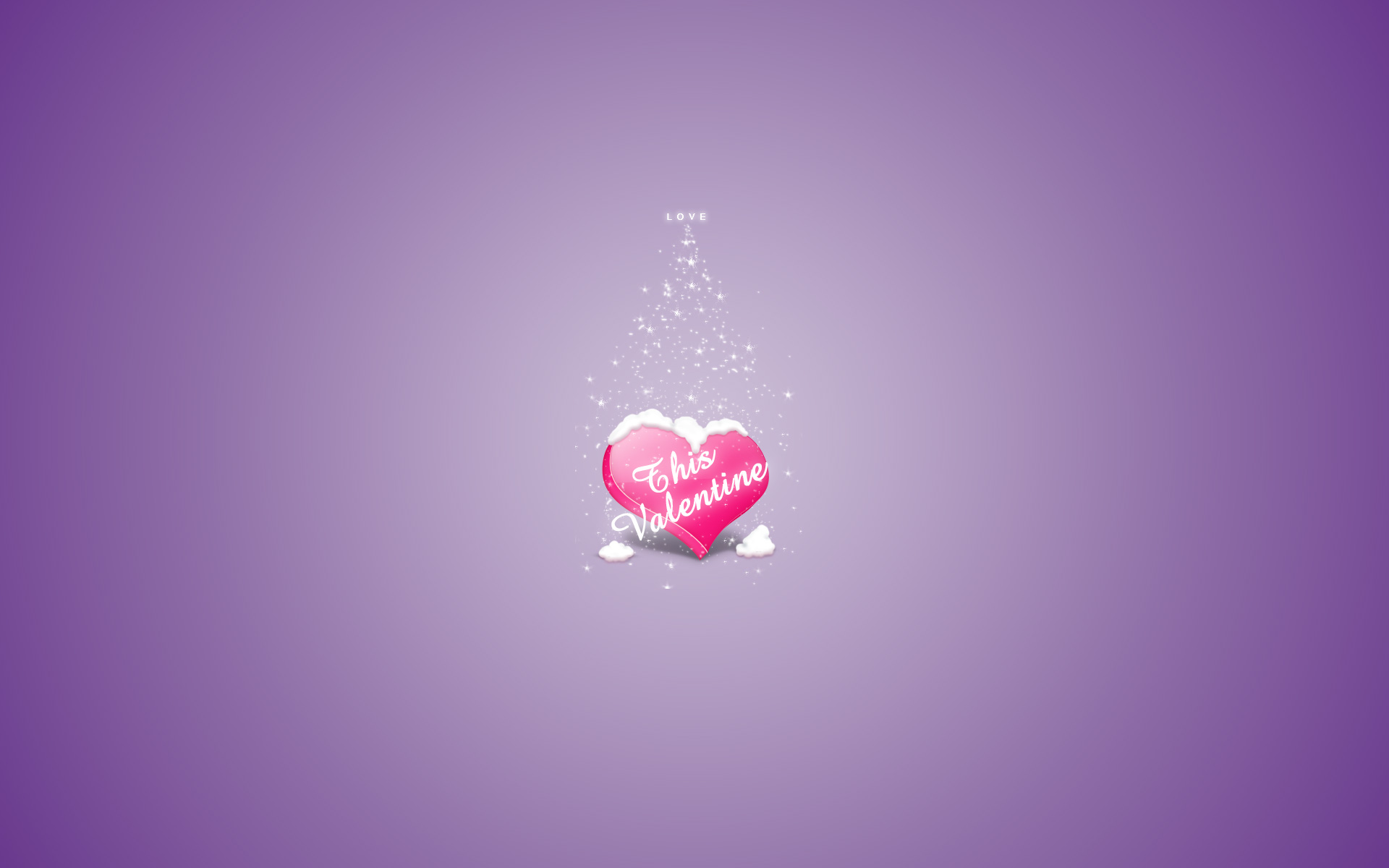 Description: A pink heart with a message on it on a purple background with snow flakes and stars around it.