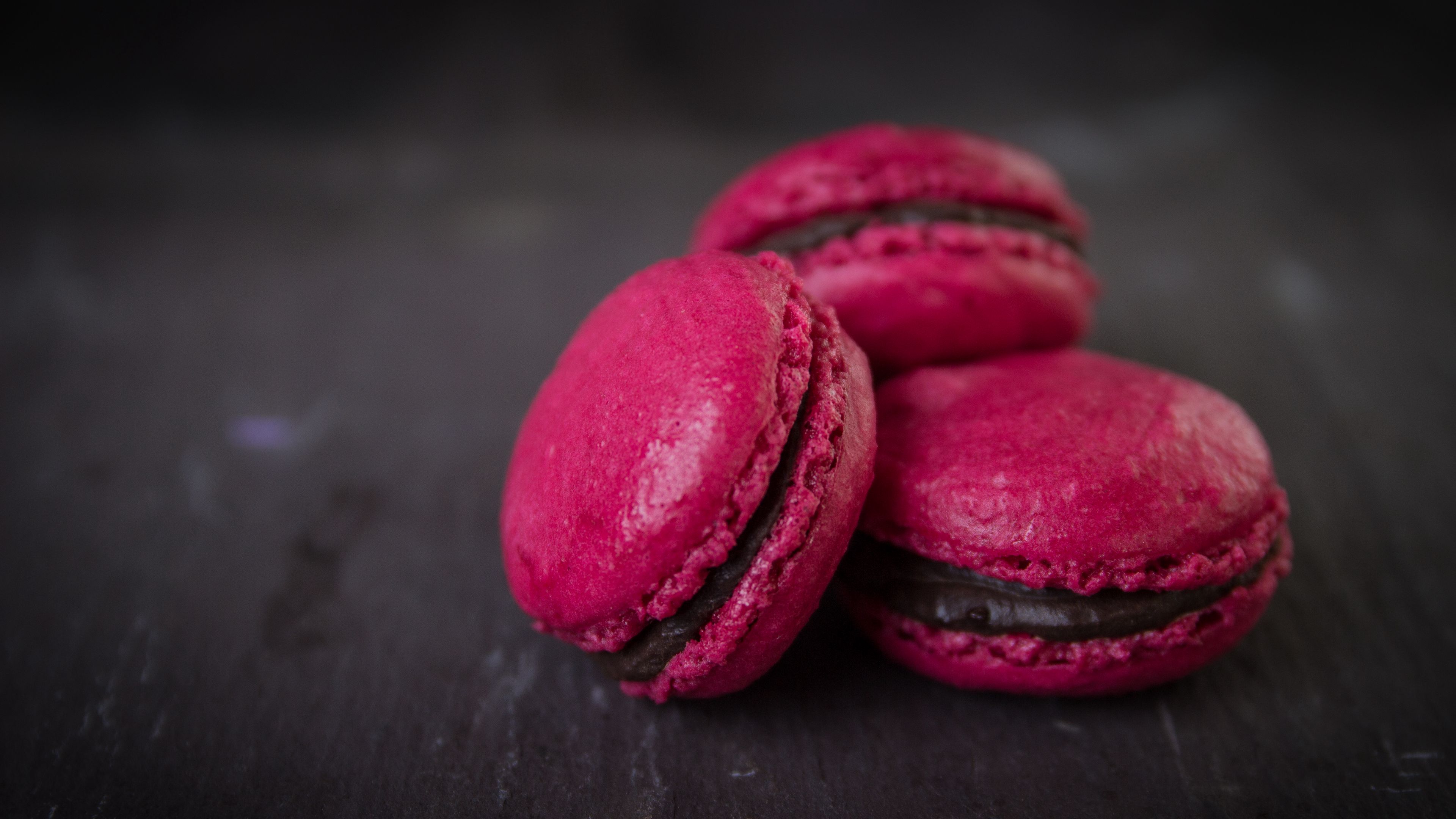 Description: A pile of pink macaroons sitting on top of a table next to each other on a table.