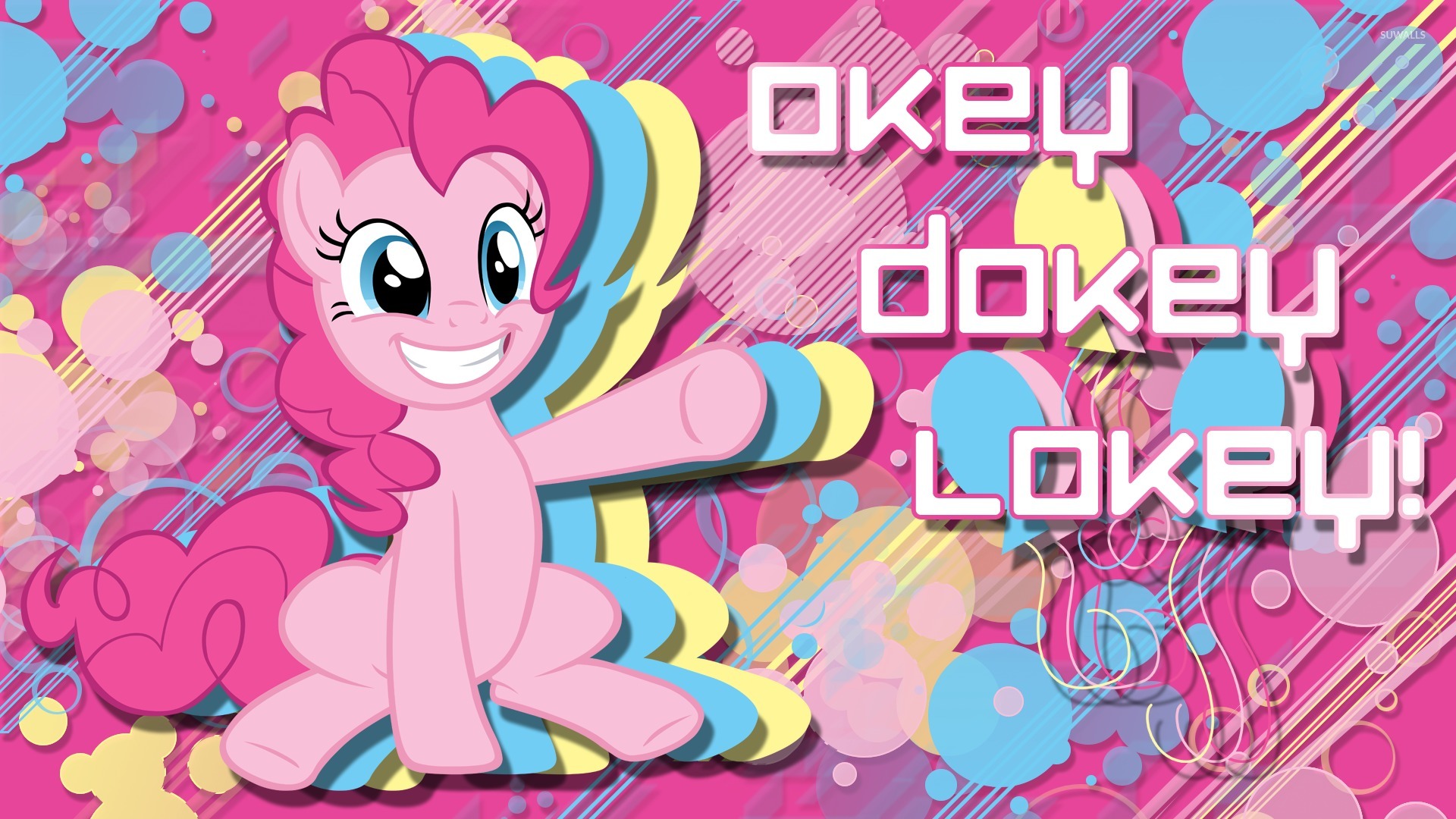 Description: A pink pony with a big smile on its face and a pink background with hearts and bubbles around it.