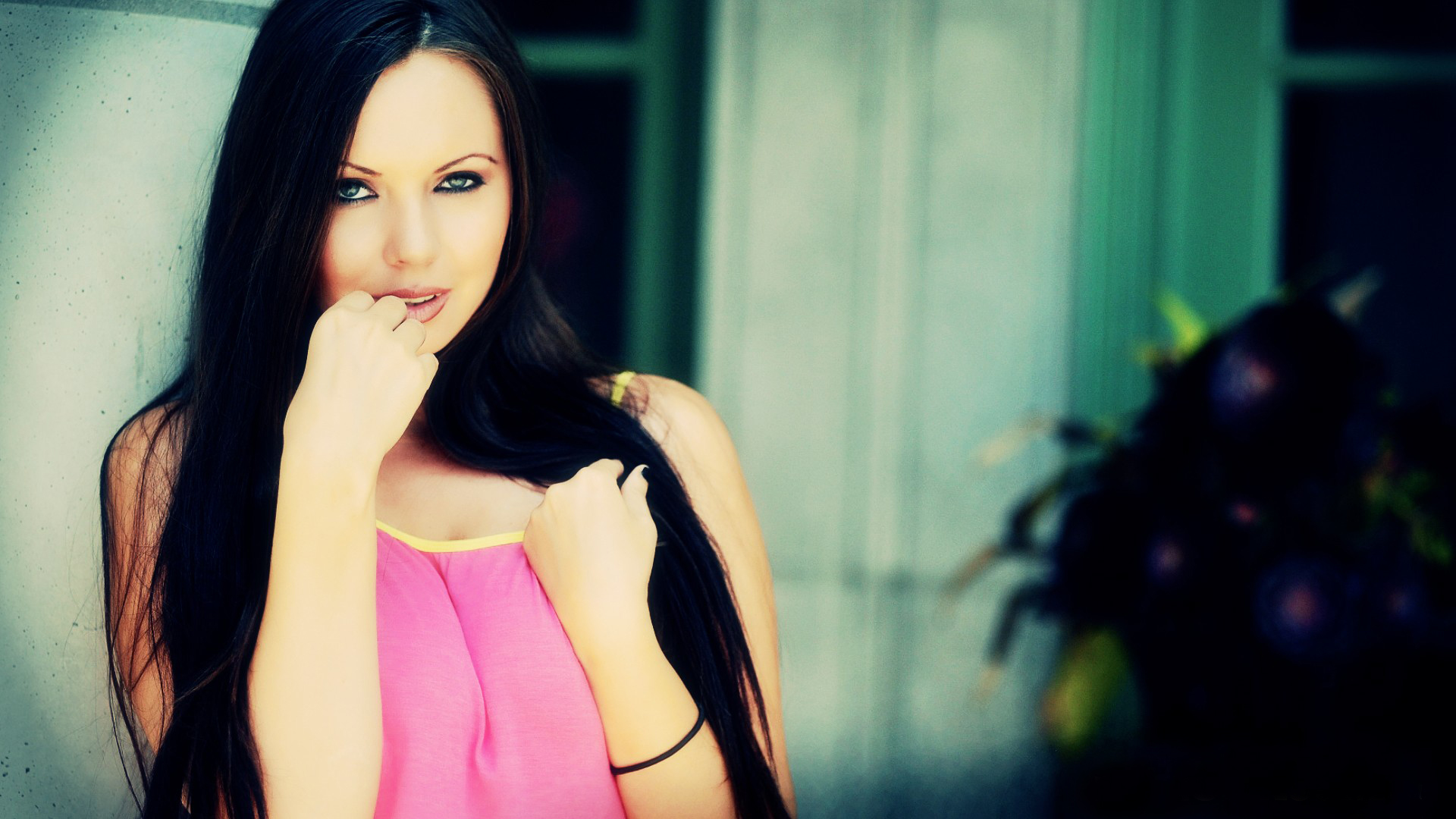 Description: A woman in a pink top posing for a picture with her hand on her face and her hand on her mouth.