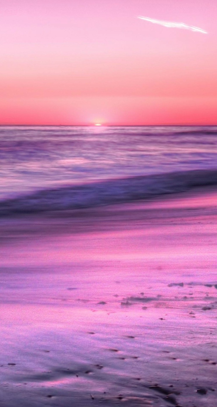 Description: A pink and purple sunset over the ocean with a surfer in the foreground and a pink sky in the background.