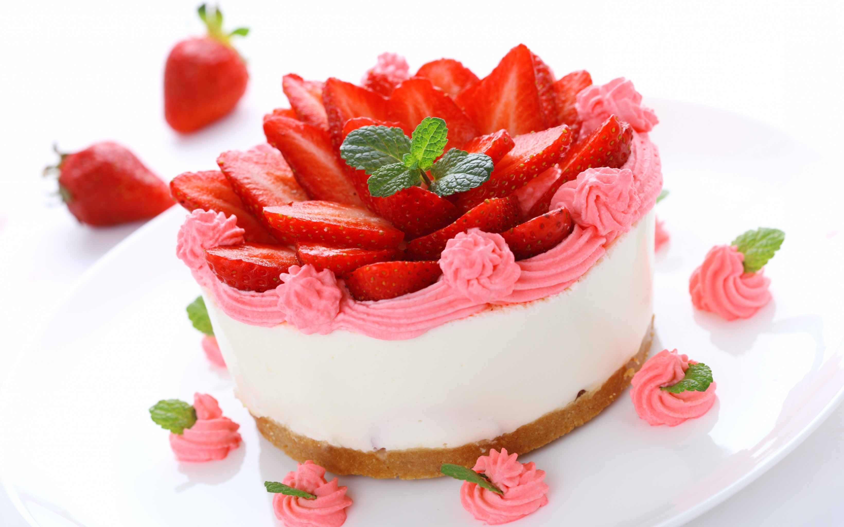 Description: A cake with strawberries on top of it on a plate with pink icing and green leaves on top.
