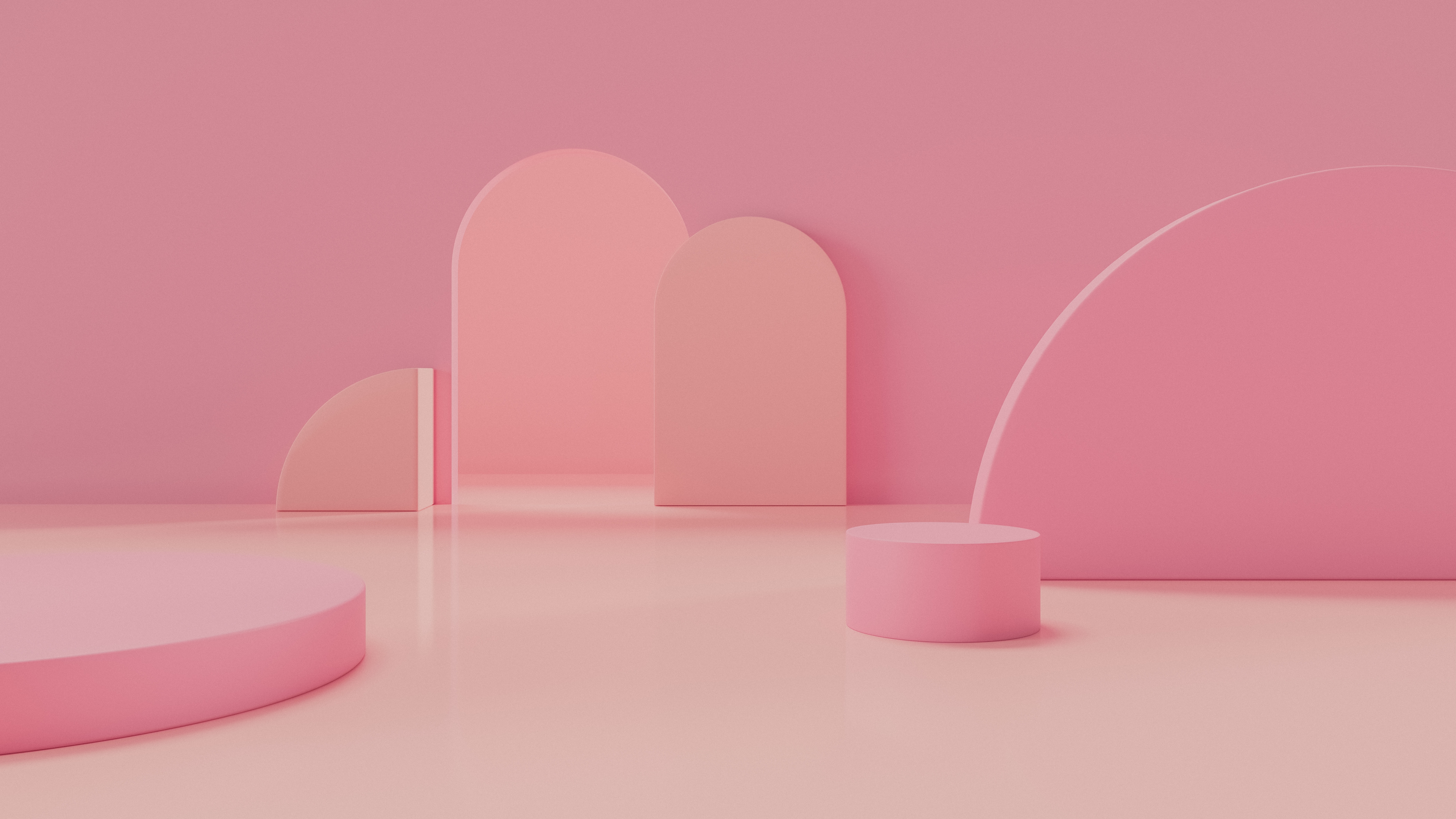 Description: A pink room with a curved pink table and a pink wall with arches and arches on it and a pink floor.