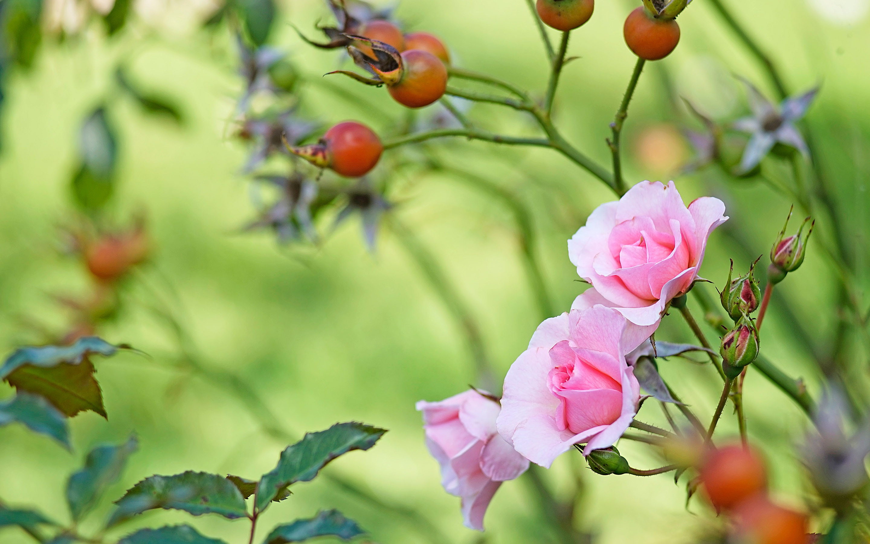 Description: A pink rose is blooming in a garden with other flowers and leaves on the stems and a blurry background.