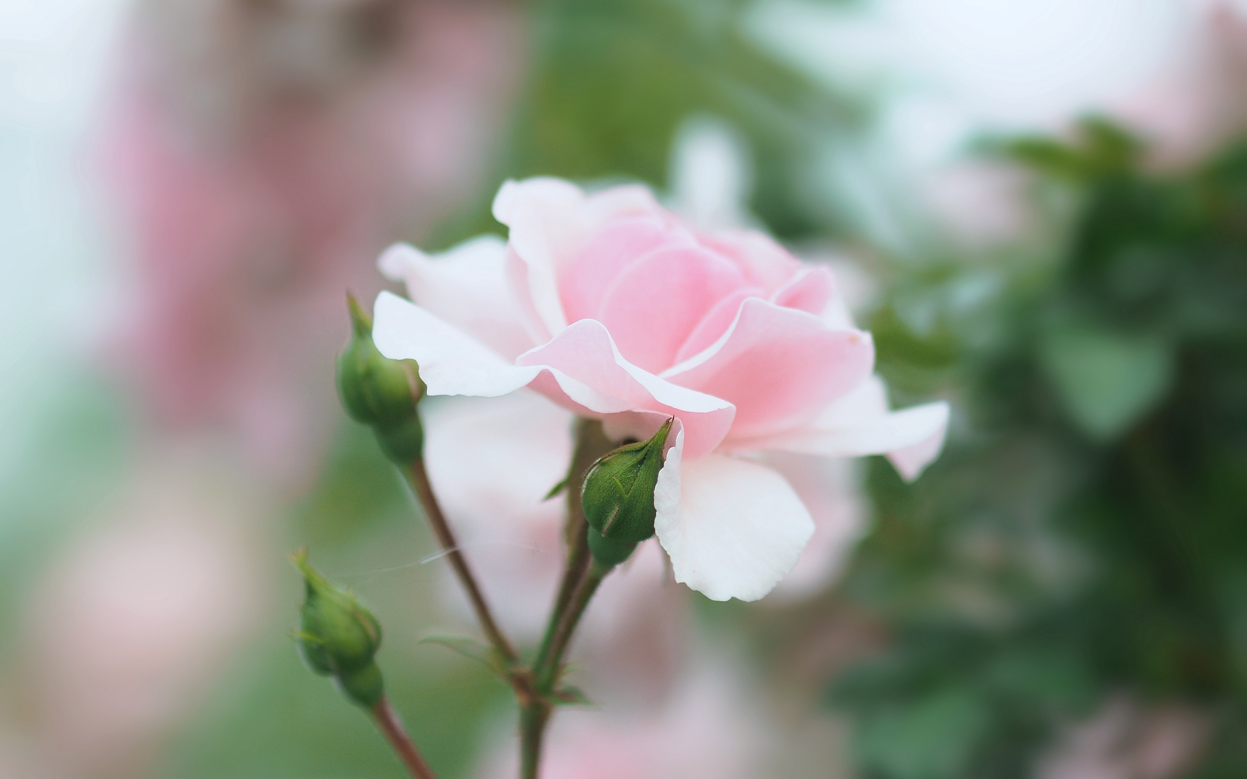 Description: A pink rose is blooming in a garden setting with blurry background and green leaves and branches in the foreground.