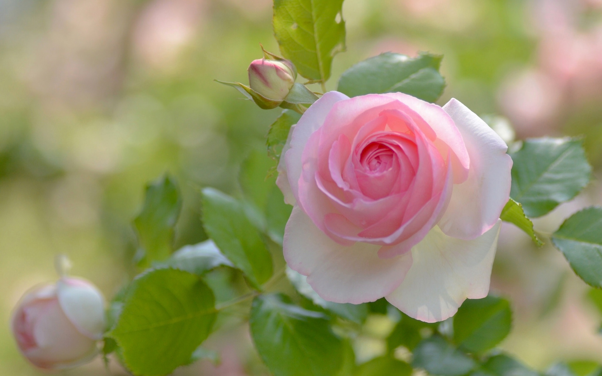 Description: A pink rose with green leaves on a branch in the sun light of the day.