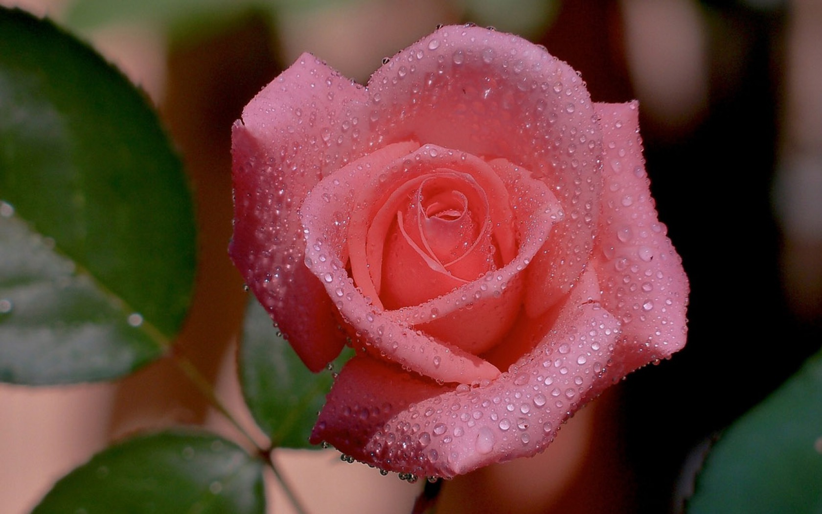 Description: A pink rose with water droplets on it's petals and leaves in the background.