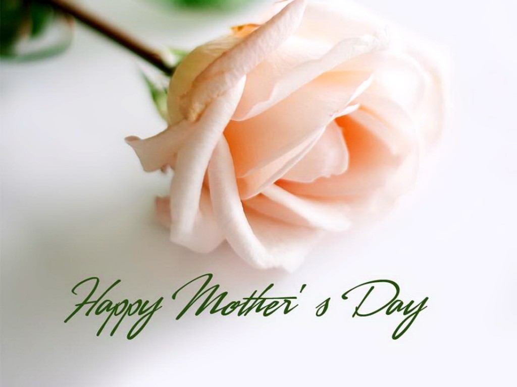 Description: A pink rose sitting on top of a white table next to a green stem and a white card with a happy mother's day message.
