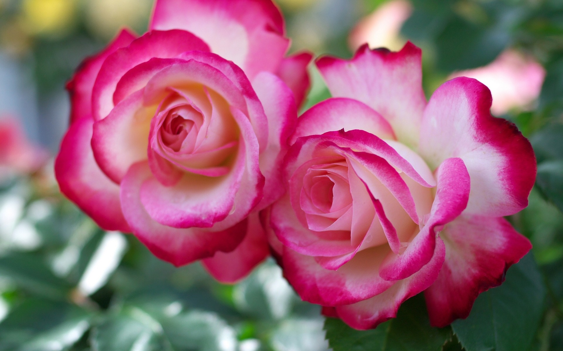 Description: Two pink roses with green leaves in a garden area with a blurry background of pink flowers and green leaves.