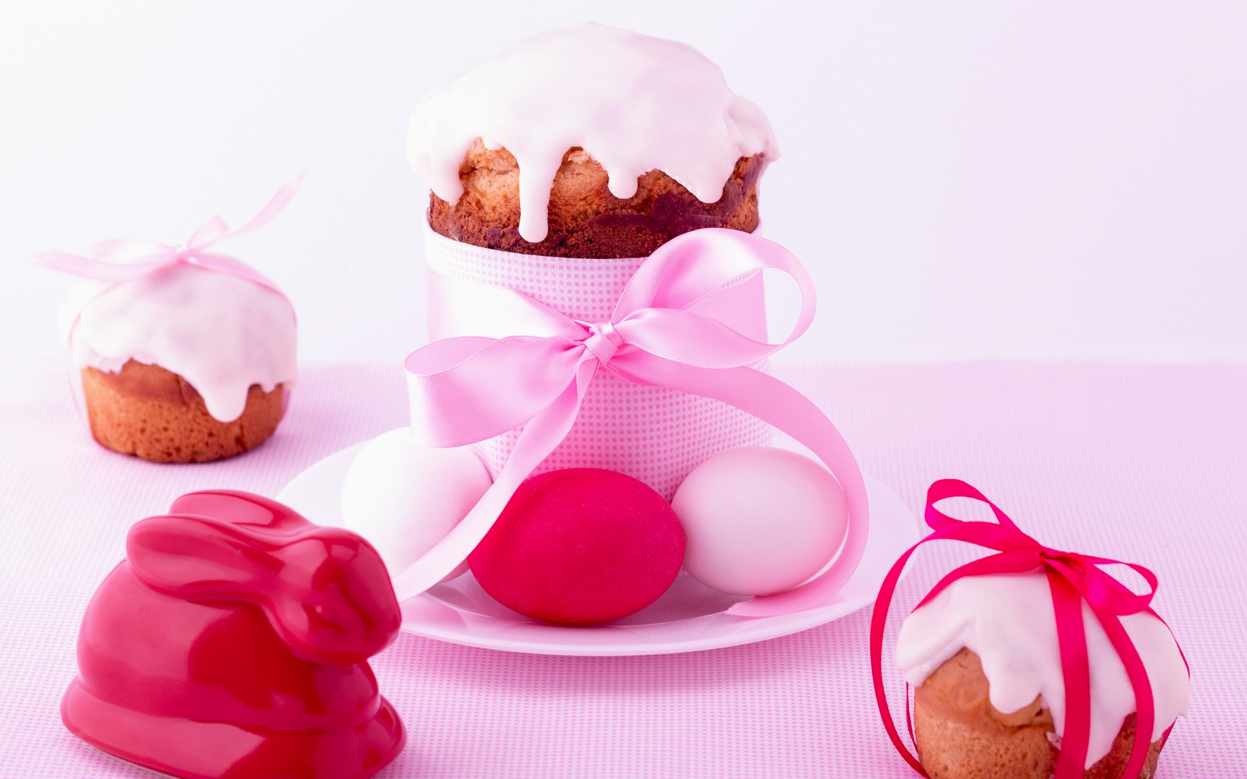 Description: A pink table with three cupcakes and a pink bow on it and a pink plate with two pink eggs.