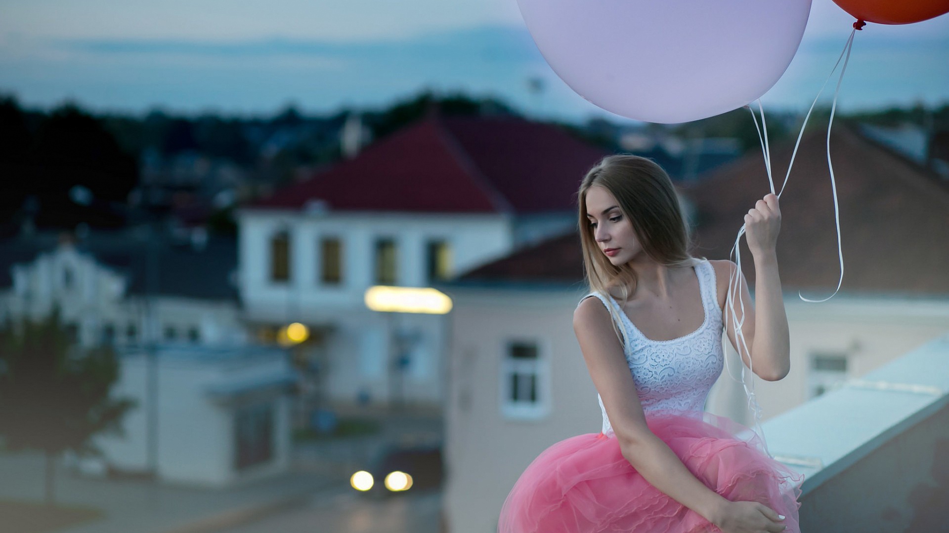 Description: A woman in a pink tutu holding two balloons in her hand and looking down at the ground with a city in the background.