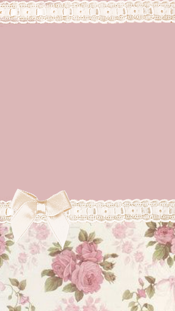 Description: A pink and white floral background with a bow on top of it and a white ribbon on the bottom of the border.