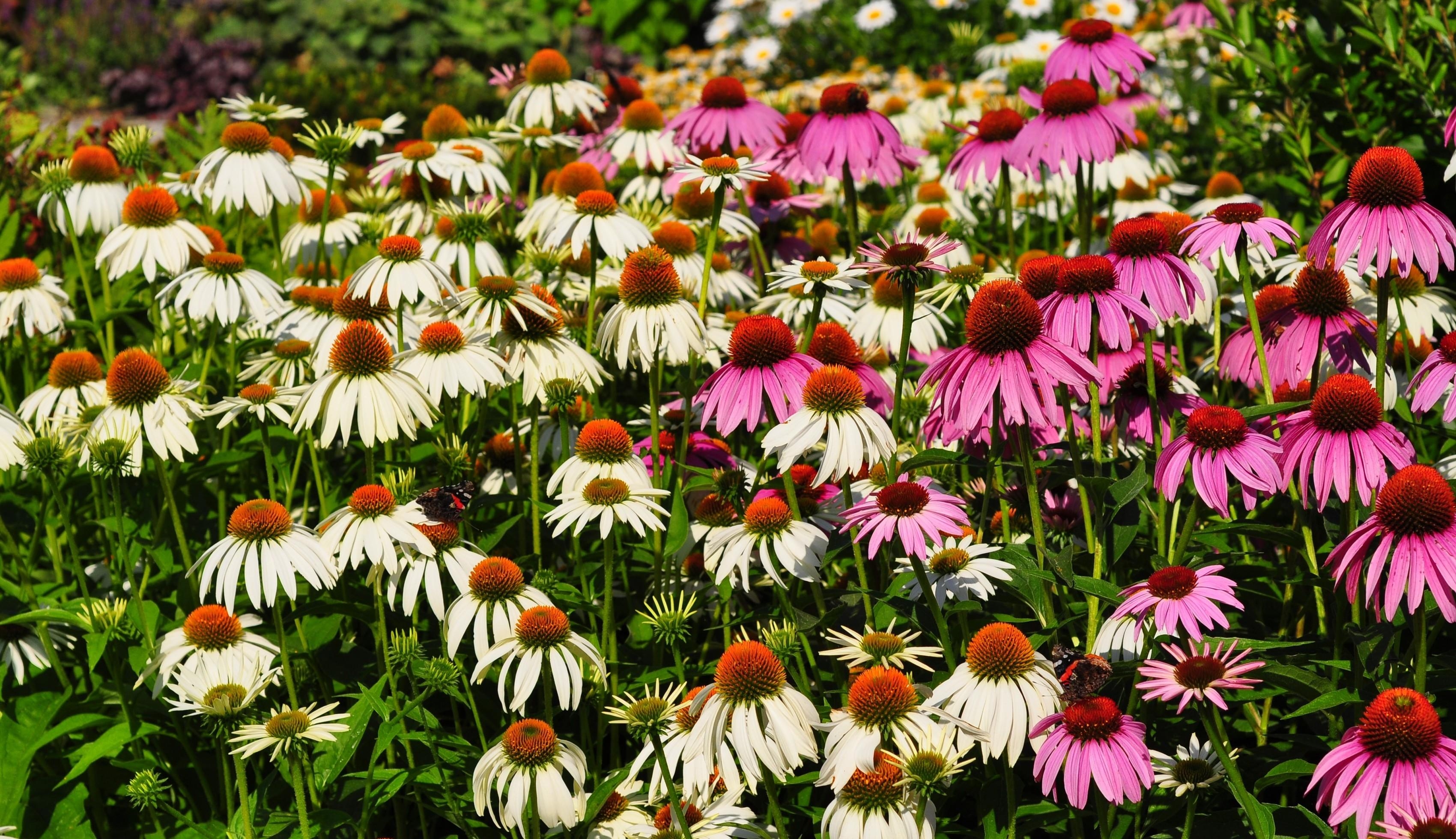 Description: A field of flowers with a lot of pink and white flowers in the middle of the field and a lot of green grass.