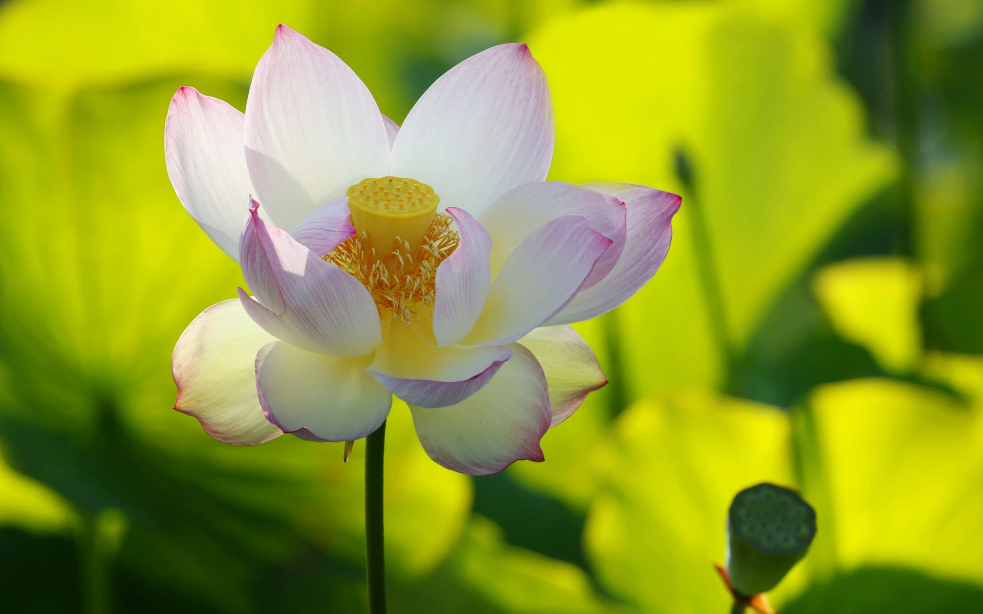 Description: A pink and white flower with green leaves in the background and a yellow center in the middle of the flower.