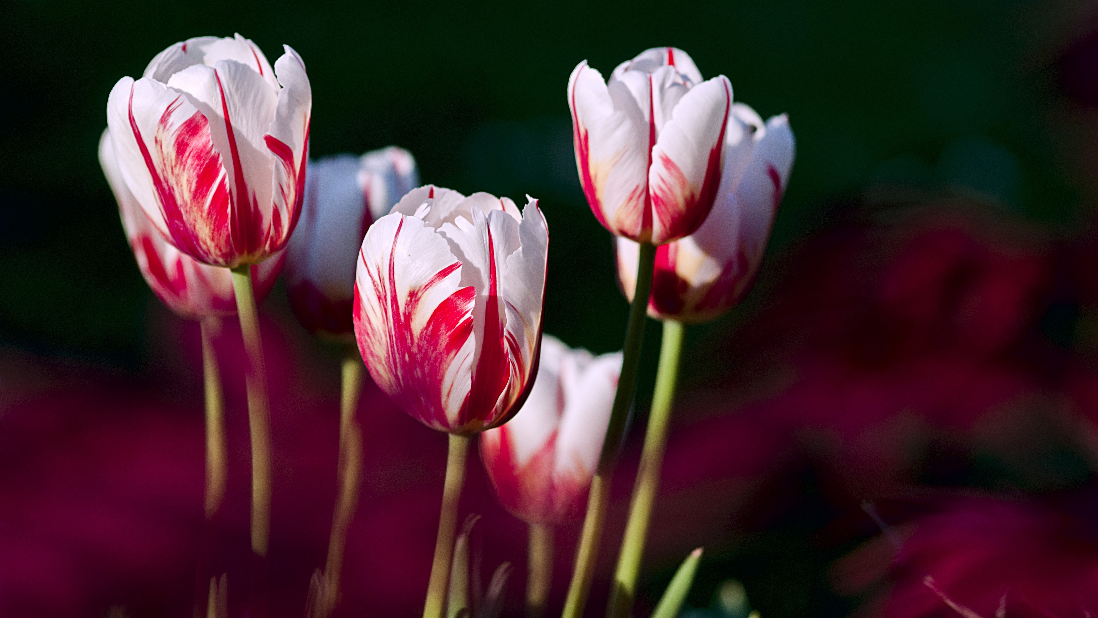 Description: A group of pink and white flowers in a garden with green leaves and purple flowers in the background and a green background.