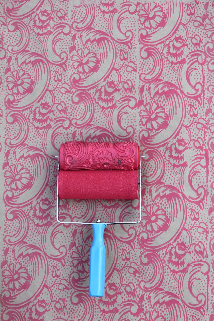 Description: A pink and white wall with a red roller on it and a pink wall paper on the wall behind it.