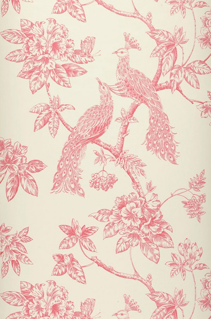 Description: A pink and white wallpaper with a bird on it's branch and flowers on it's side.