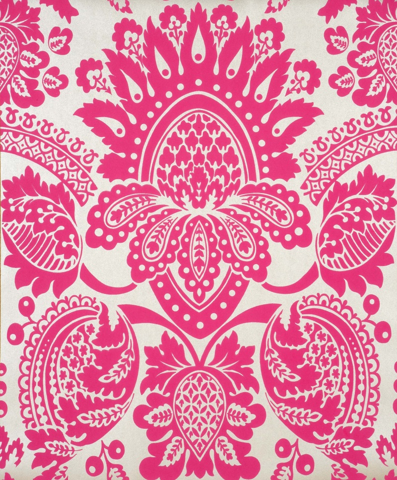 Description: A pink and white wallpaper with a large flower design on it's side.
