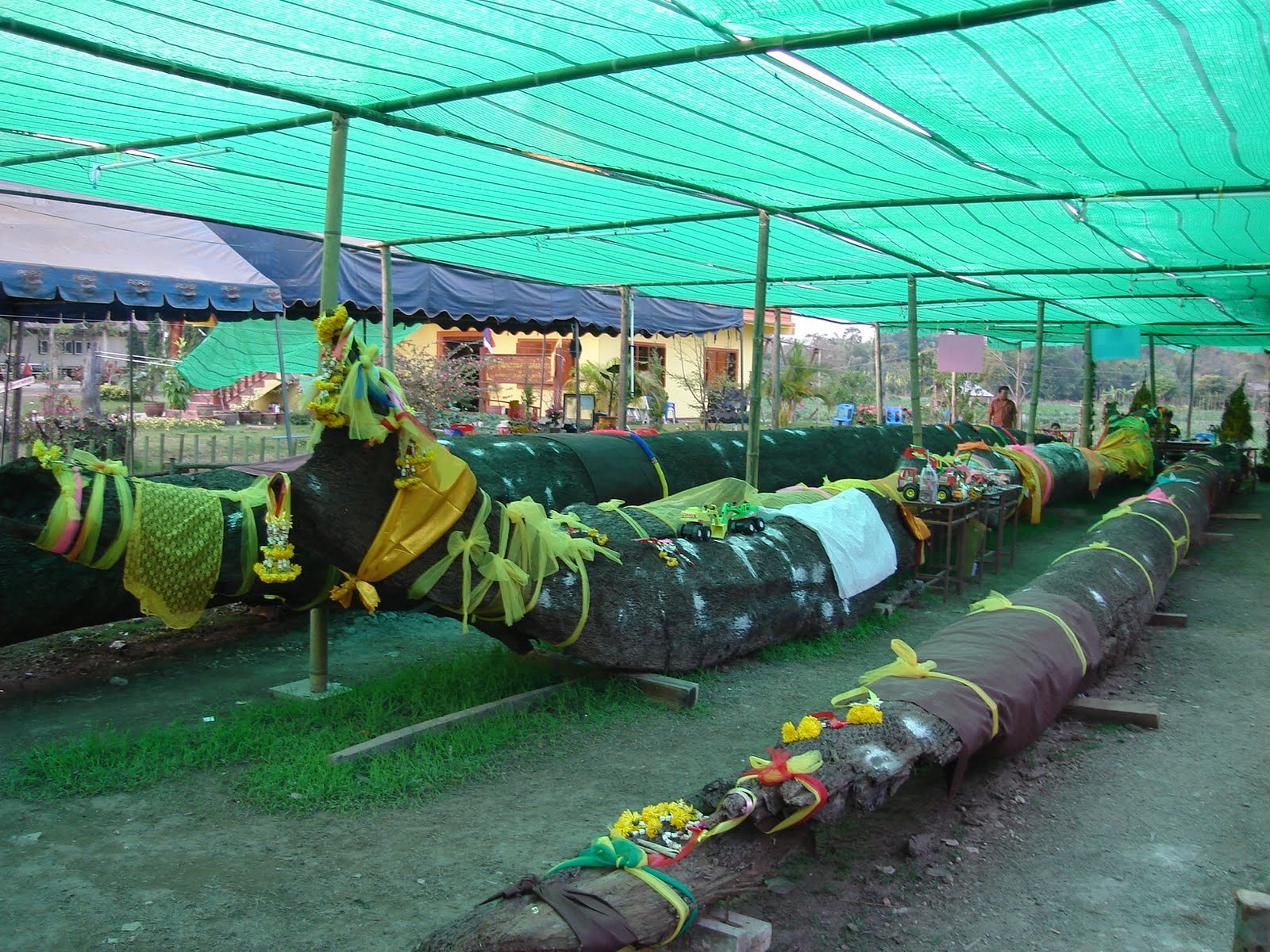 Description: A row of large pipes sitting under a tent in a field of grass and dirt with a green tarp.