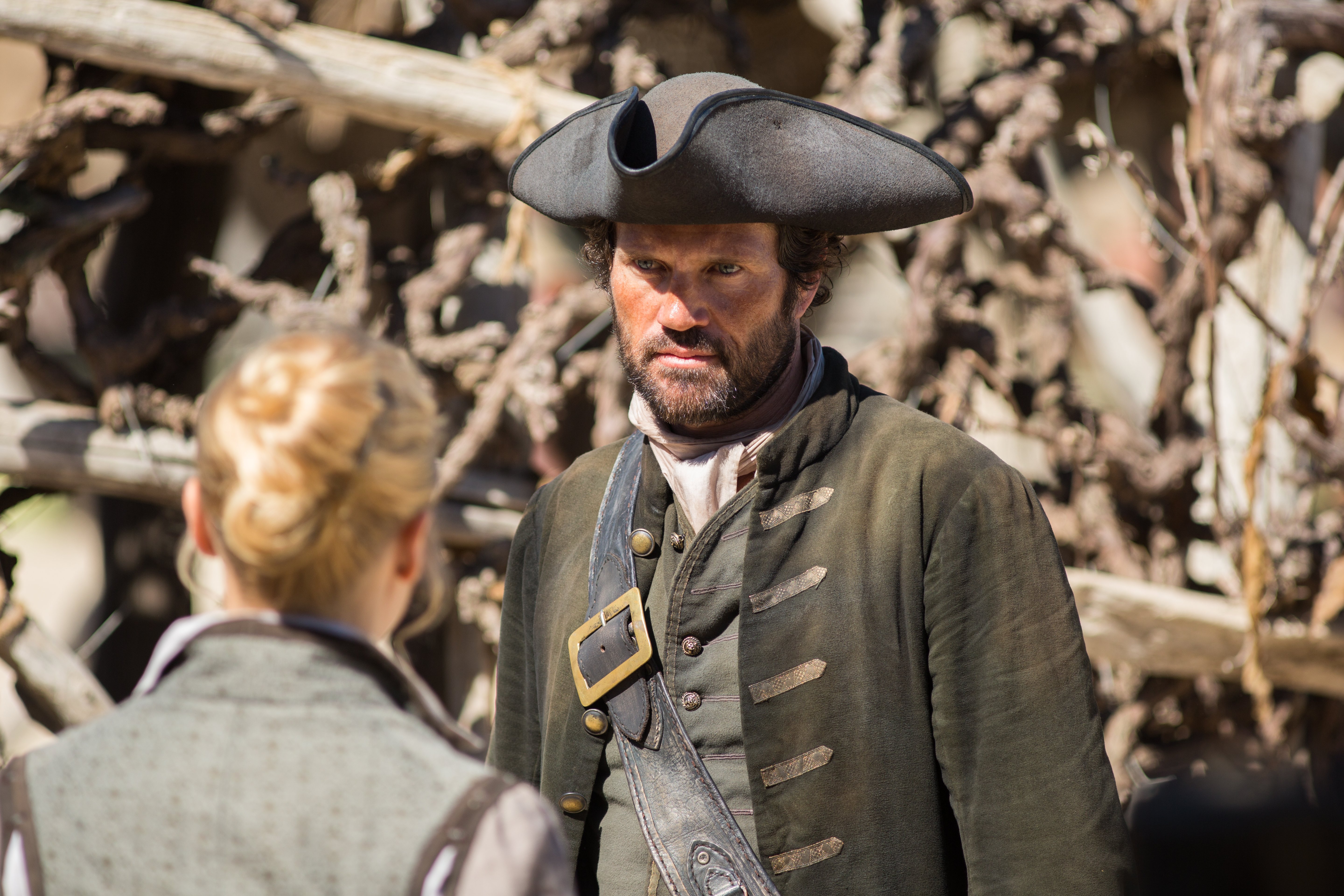 Description: A man in a pirate costume standing next to a woman in a dress and hat with a gun in her hand.