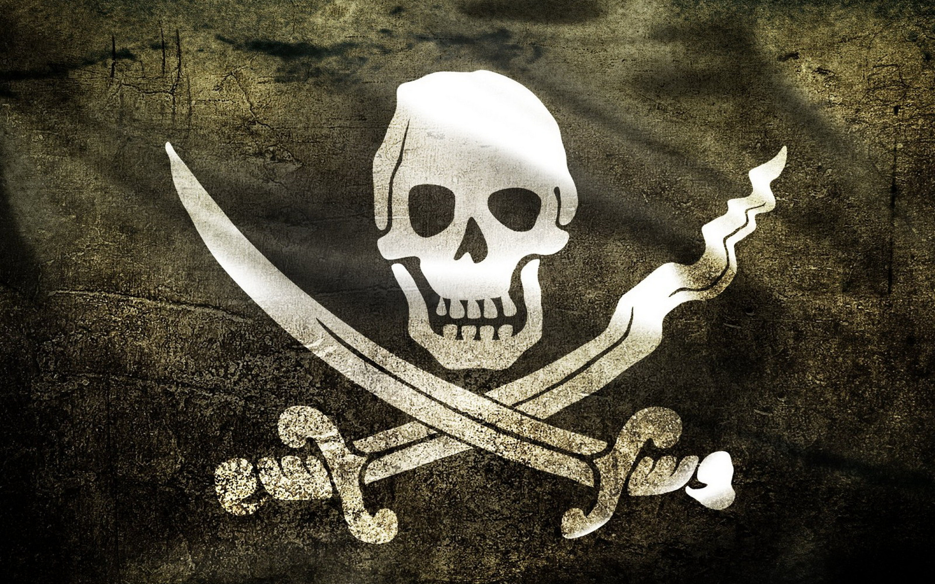 Description: A pirate flag with a skull and crossbones on it and a knife in the middle of the flag.