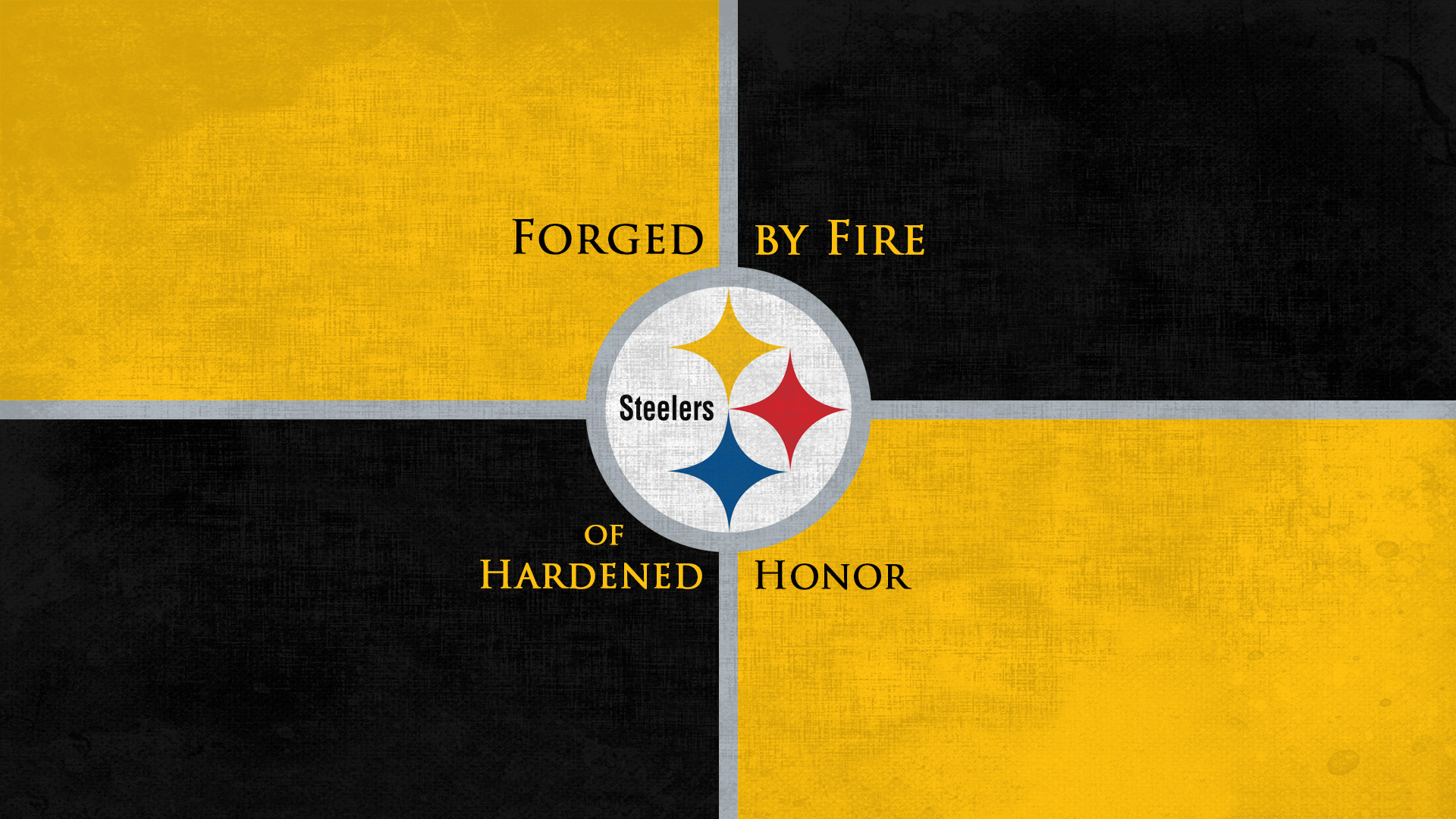Description: A pittsburgh football team logo on a black and yellow background with the words forgeter by fire of hardened honor.