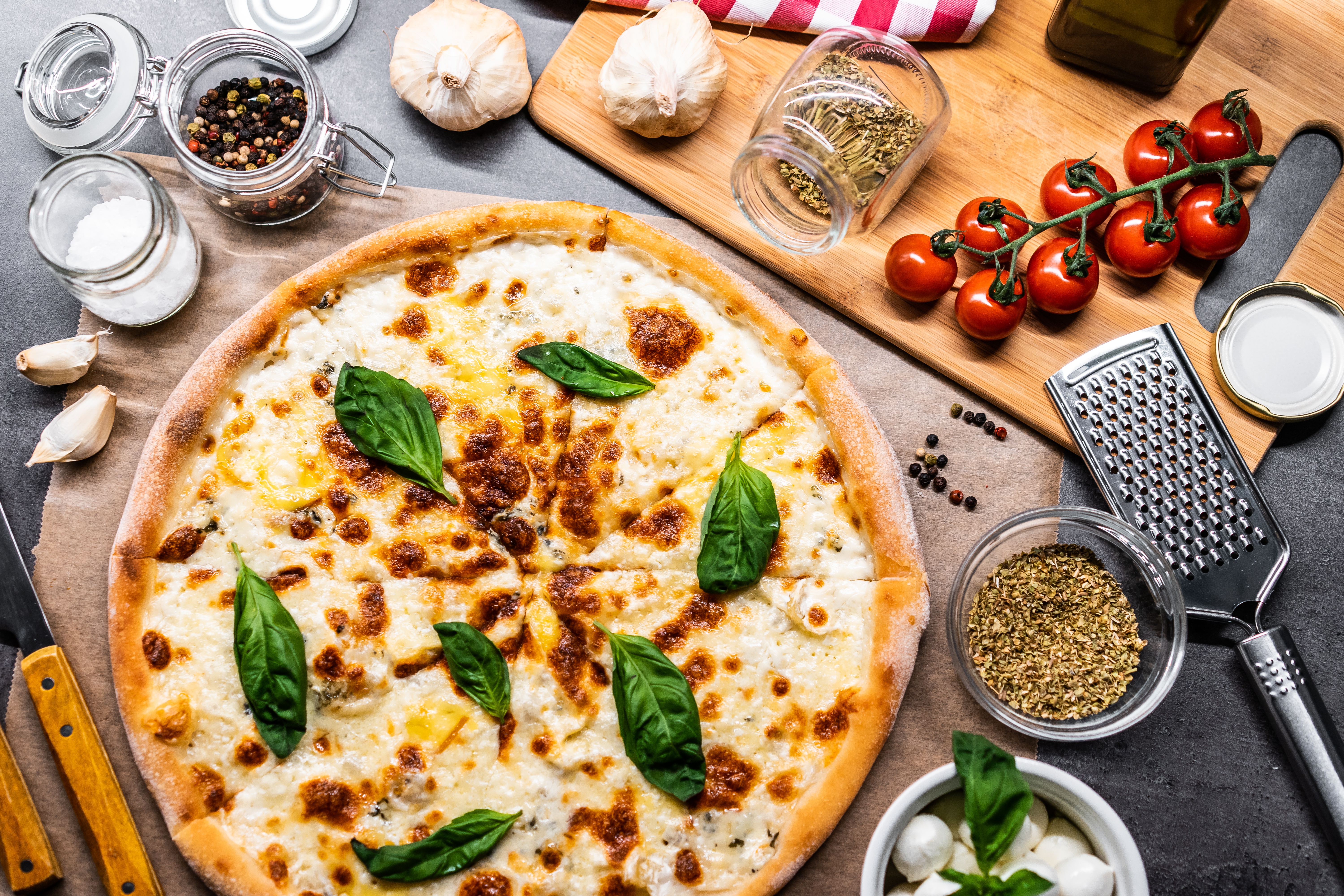 Description: A pizza with basil leaves on top of it next to other ingredients and utensils on a table.