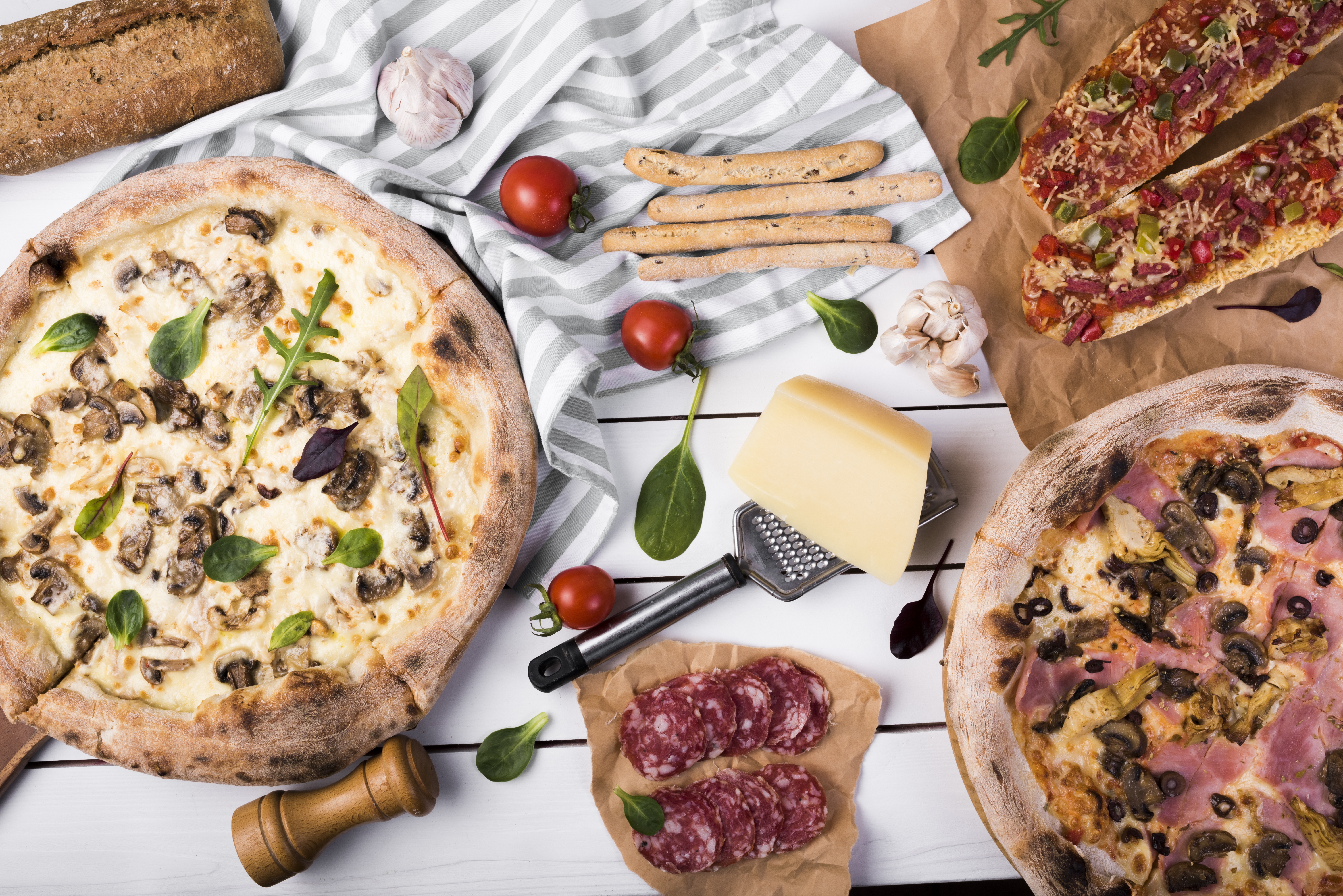 Description: A table topped with pizzas and other food items next to bread sticks and cheese sticks and bread sticks.