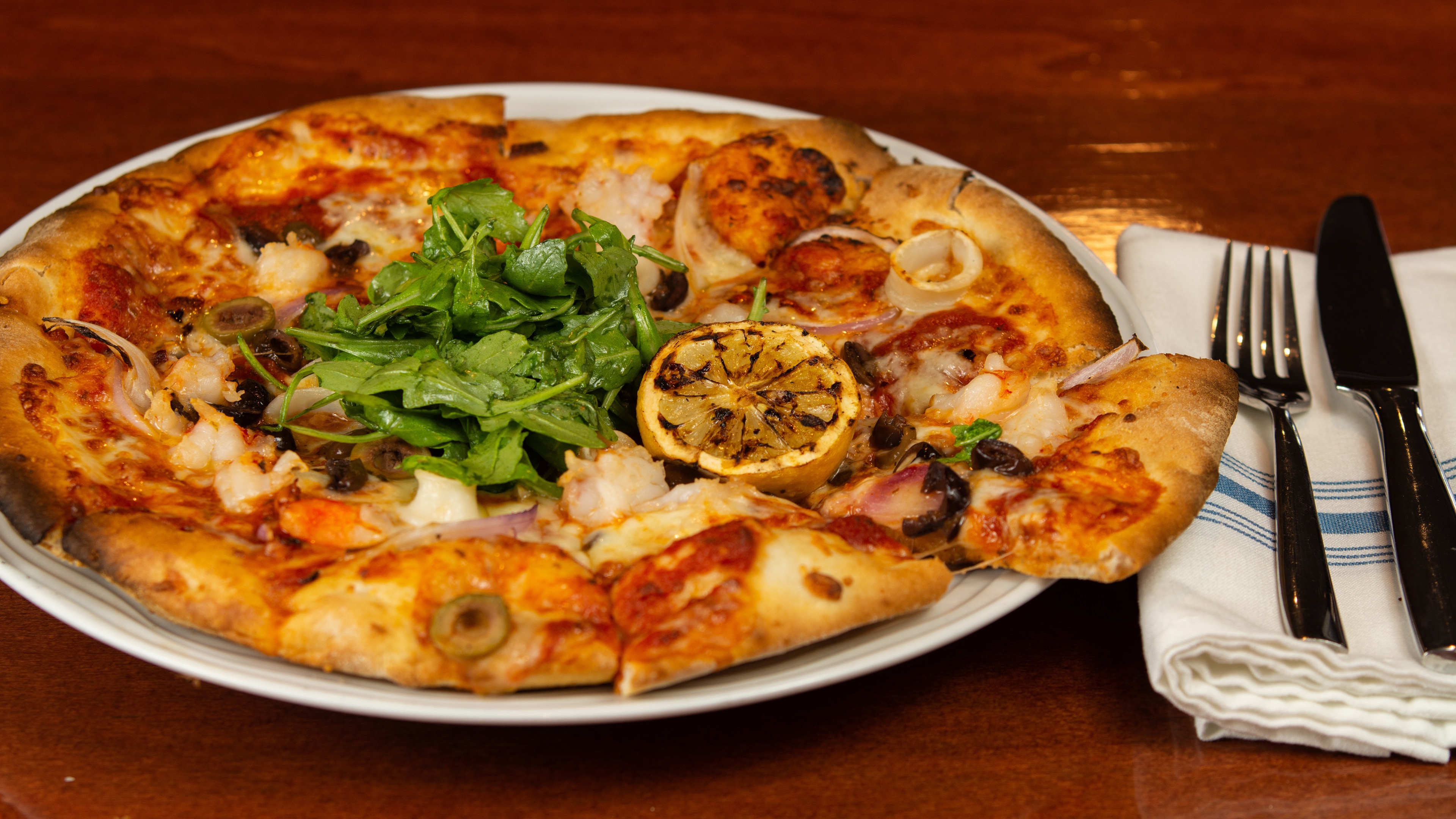 Description: A pizza with a slice of lemon on a plate with a fork and knife on a table with a napkin and napkin.