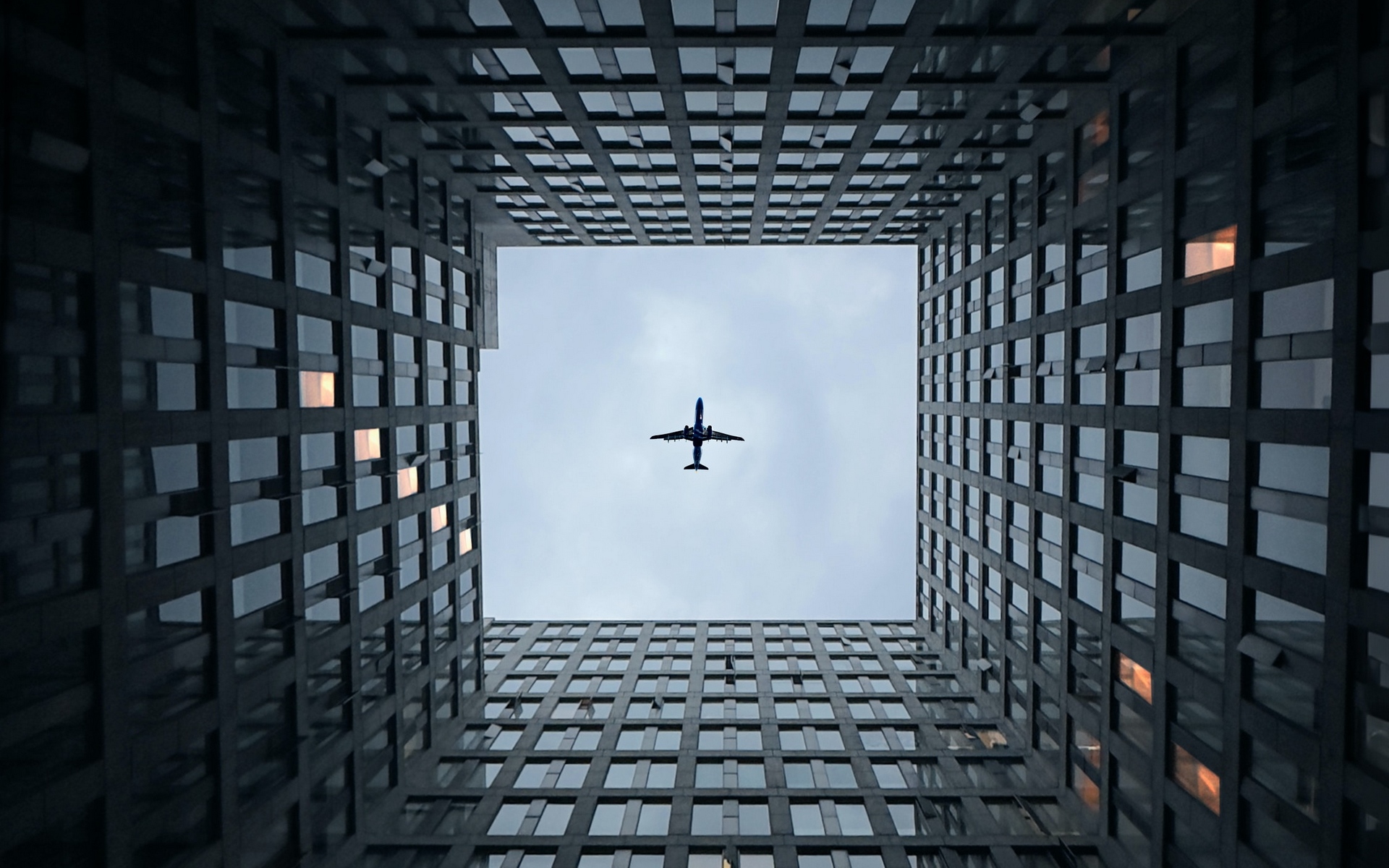 Description: A plane flying through a very tall building with a sky background and a grid pattern on the floor of the building.