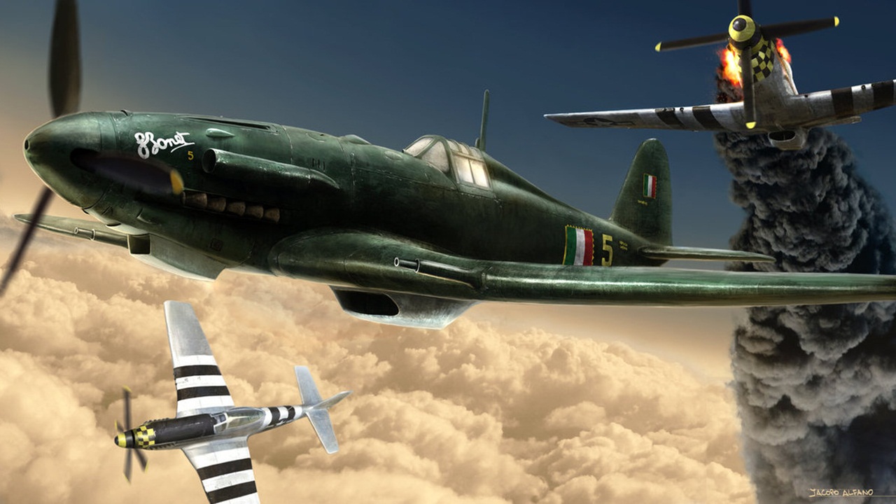 Description: A painting of a plane flying over a cloud filled sky with a jet fighter in the foreground and a plane in the background.