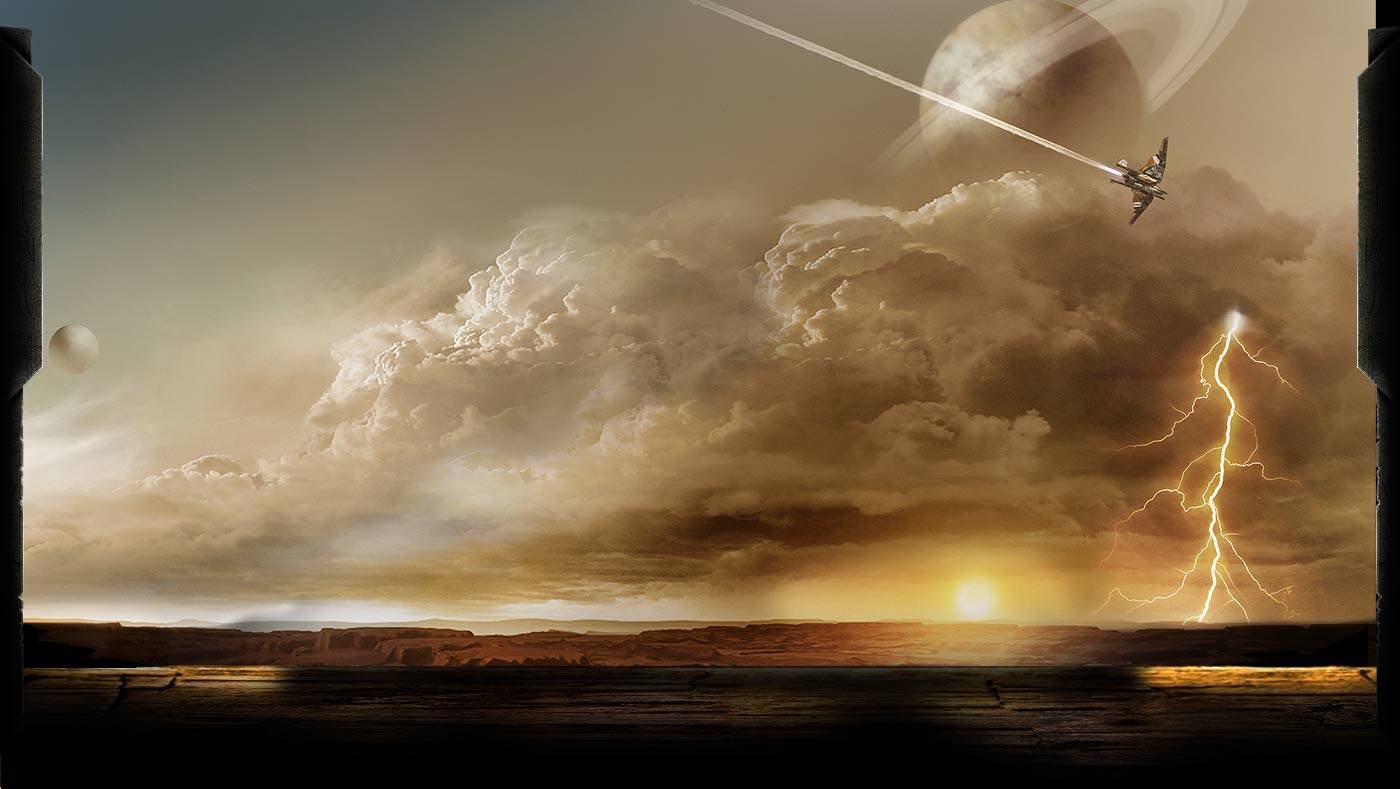 Description: A plane flying through a cloudy sky with a lightning bolt in the distance and a sun in the background.