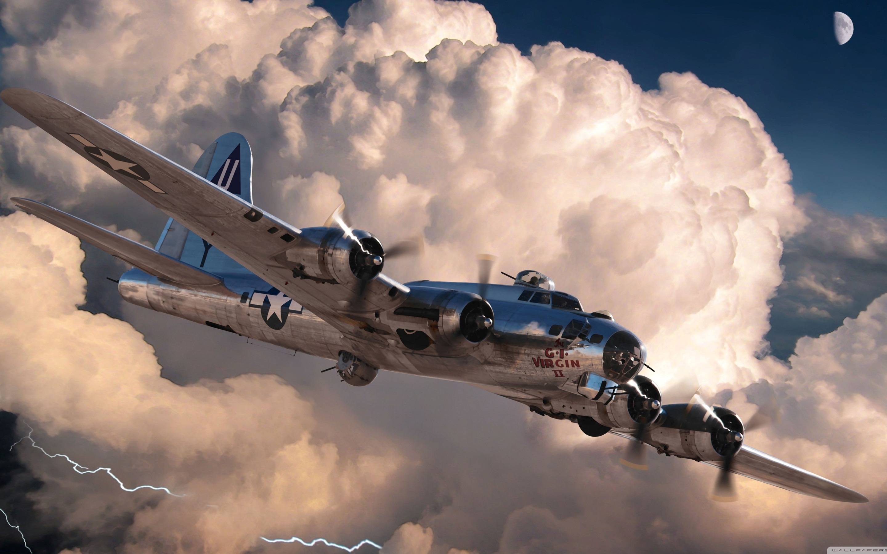 Description: A plane flying through a cloudy sky with a moon in the background and clouds in the foreground.