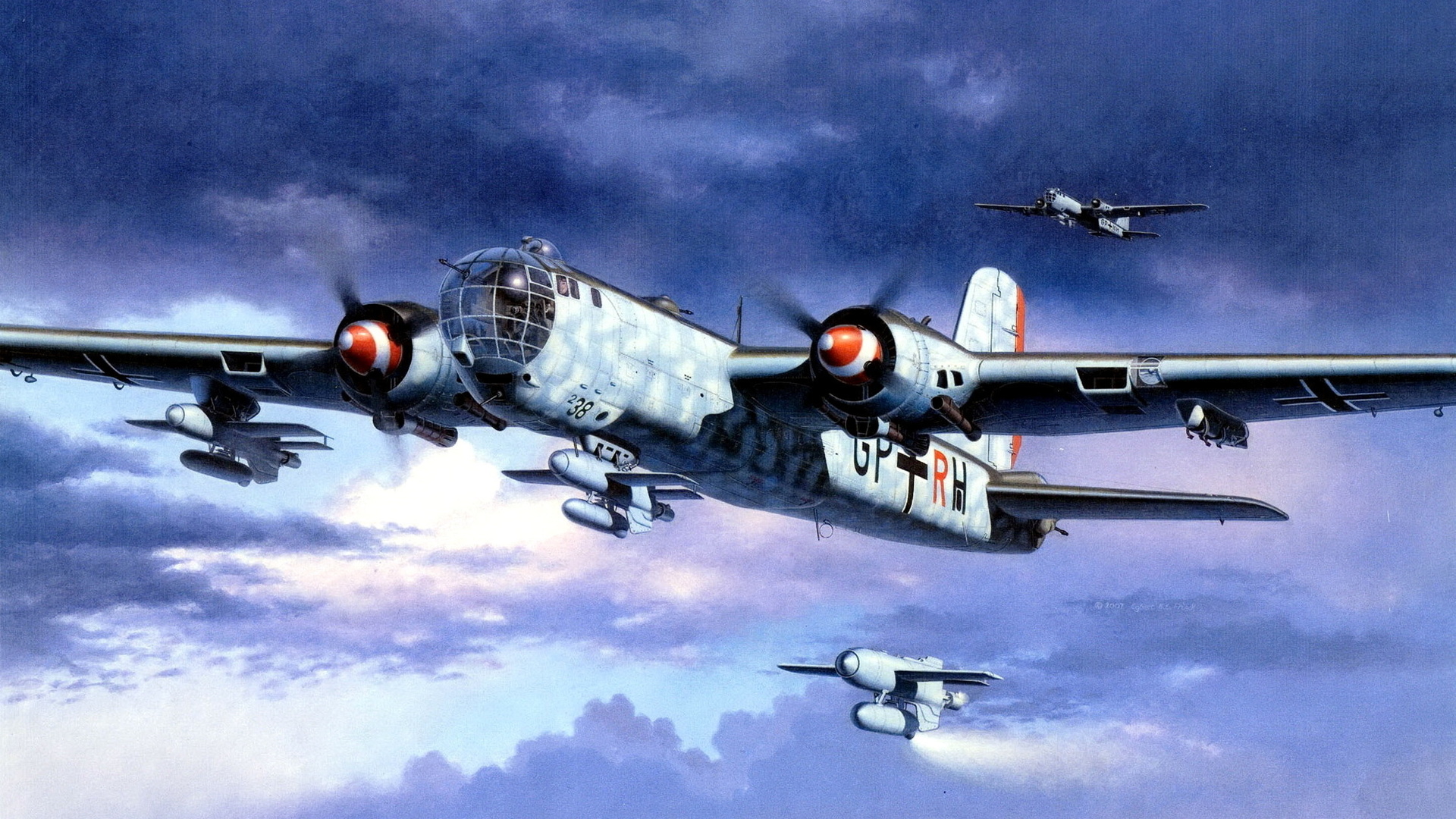 Description: A painting of a plane flying in the sky with other planes flying around it in the background and a plane in the foreground.