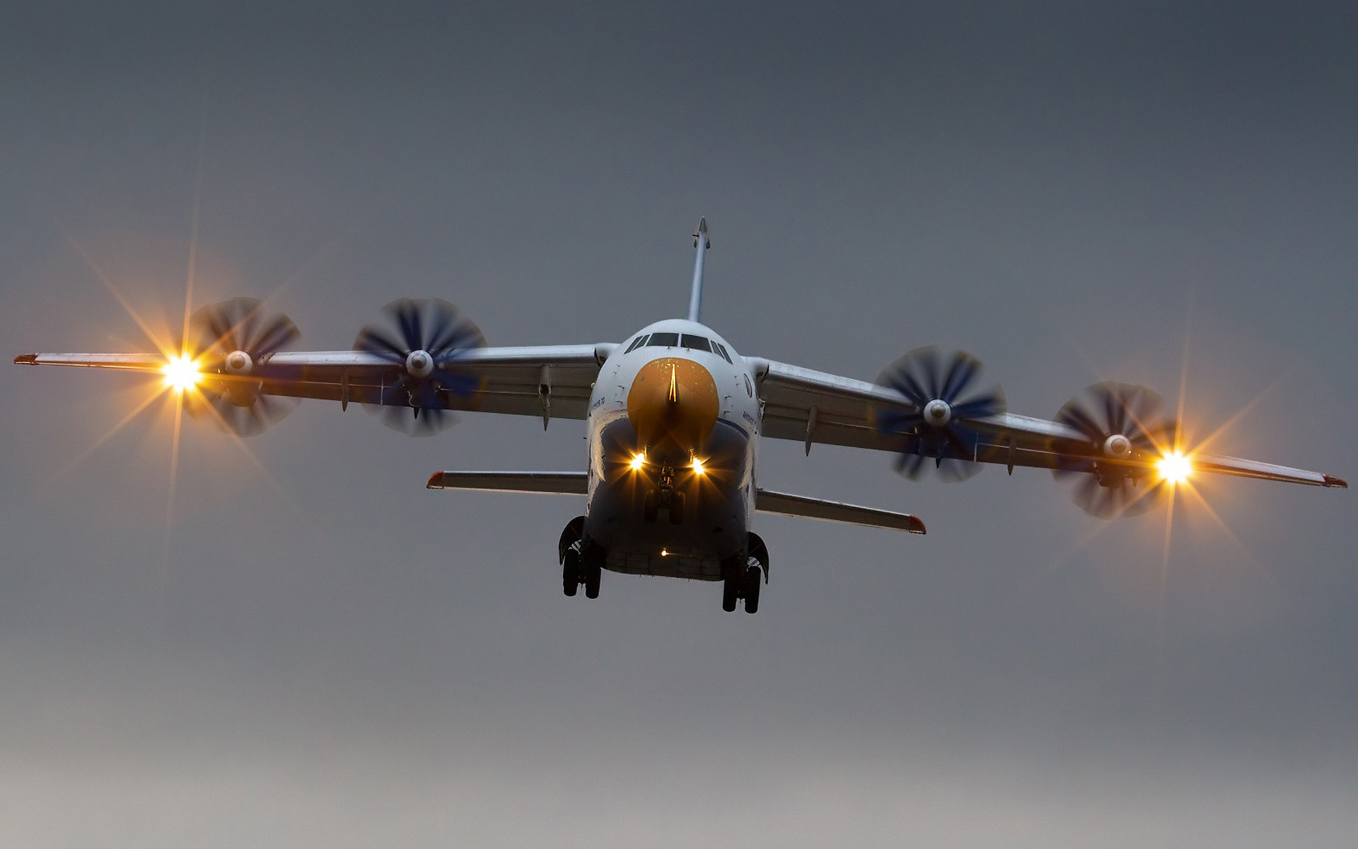 Description: A plane with lights on it flying in the sky with a dark background and a few clouds in the sky.