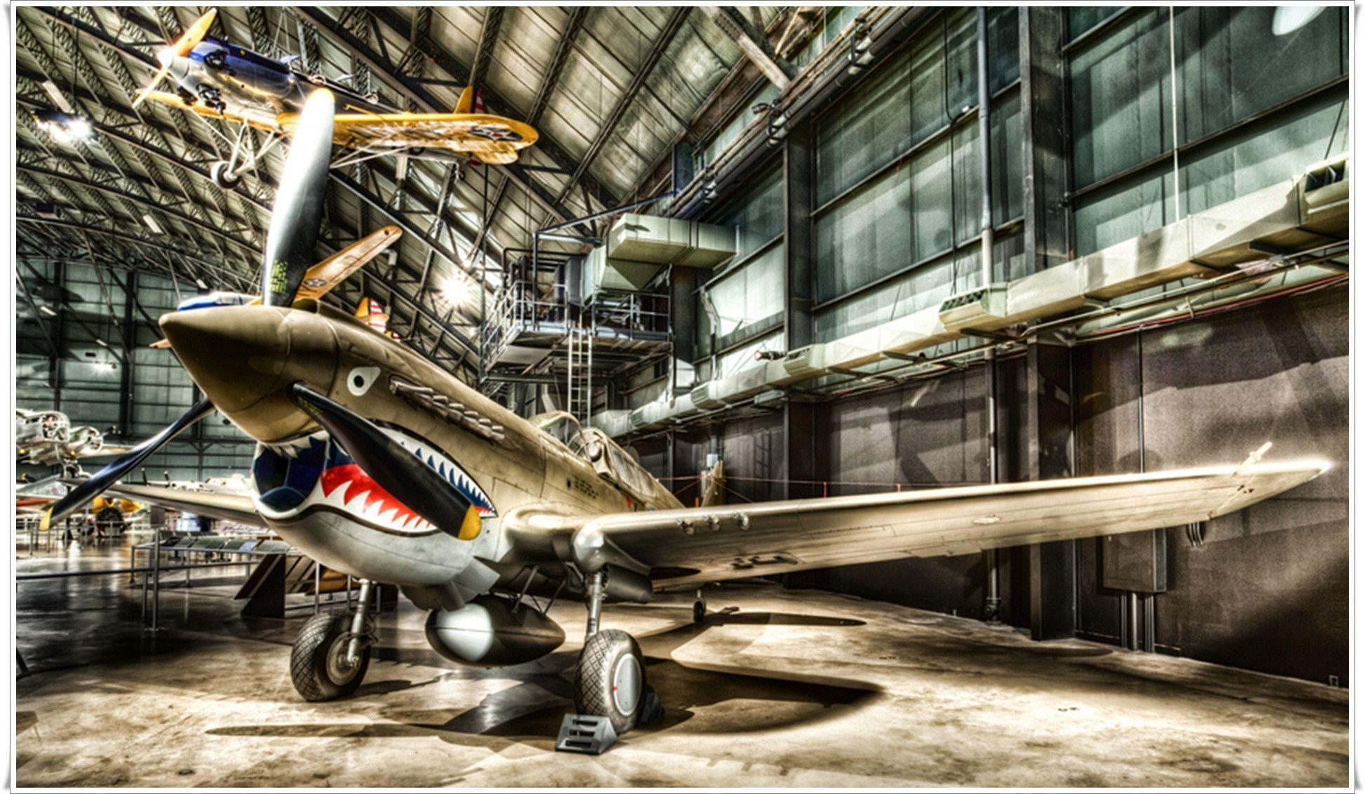 Description: A plane is parked inside of a building with a shark fin on the side of it's wing.