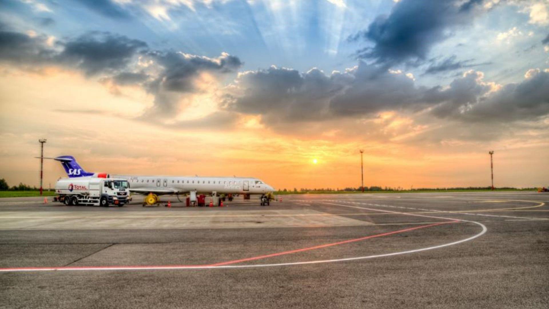 Description: A plane is parked on the runway at sunset or dawn.