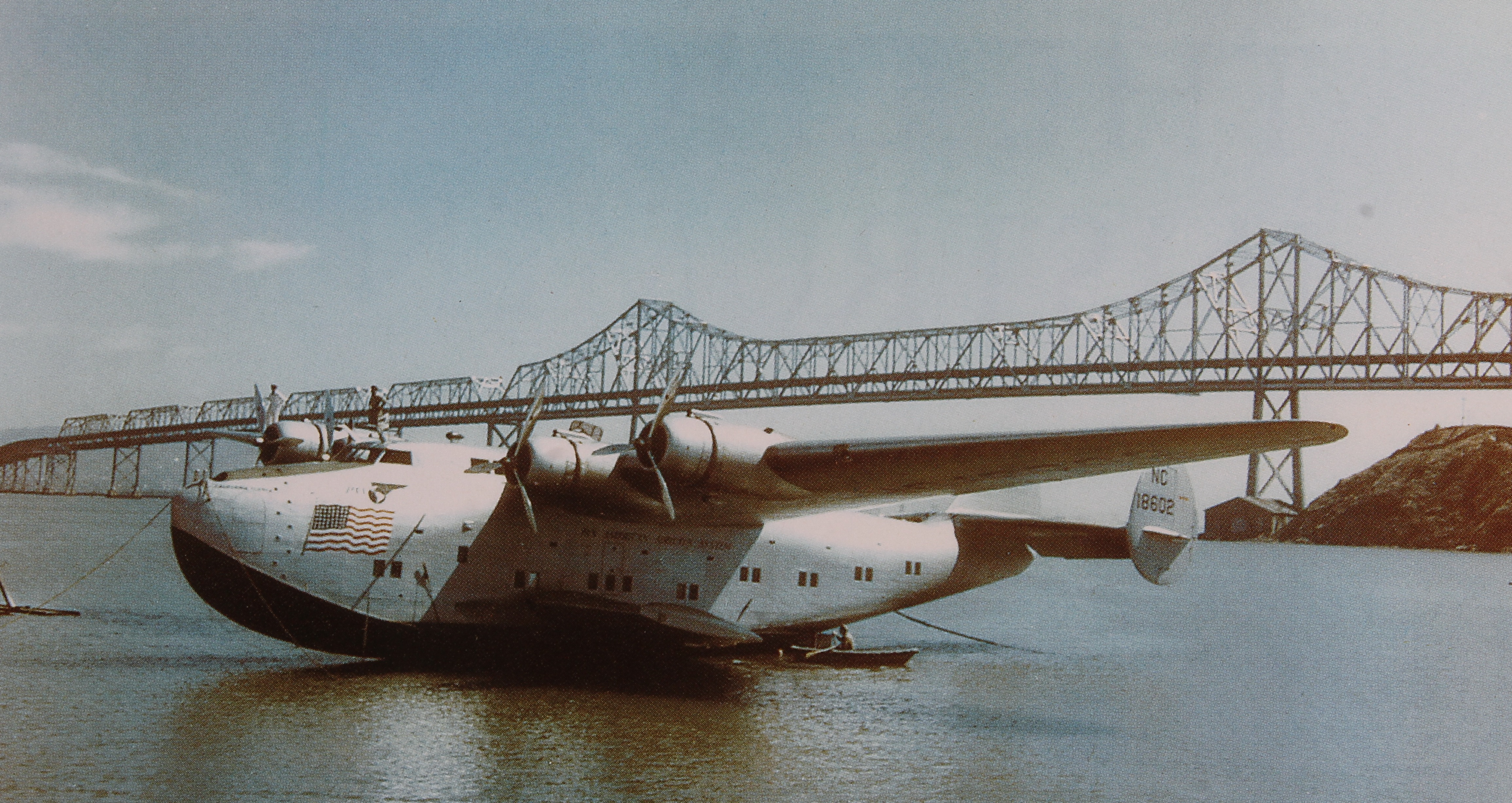 Description: A plane is sitting in the water near a bridge and a boat in the water with a bridge in the background.