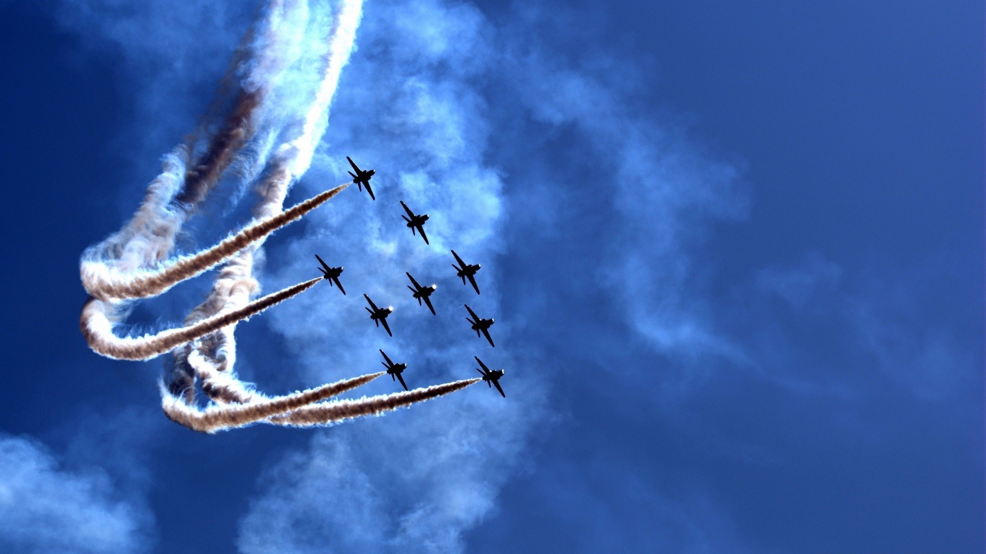 Description: A group of planes flying in formation in the sky with smoke trailing from them and trailing behind them.