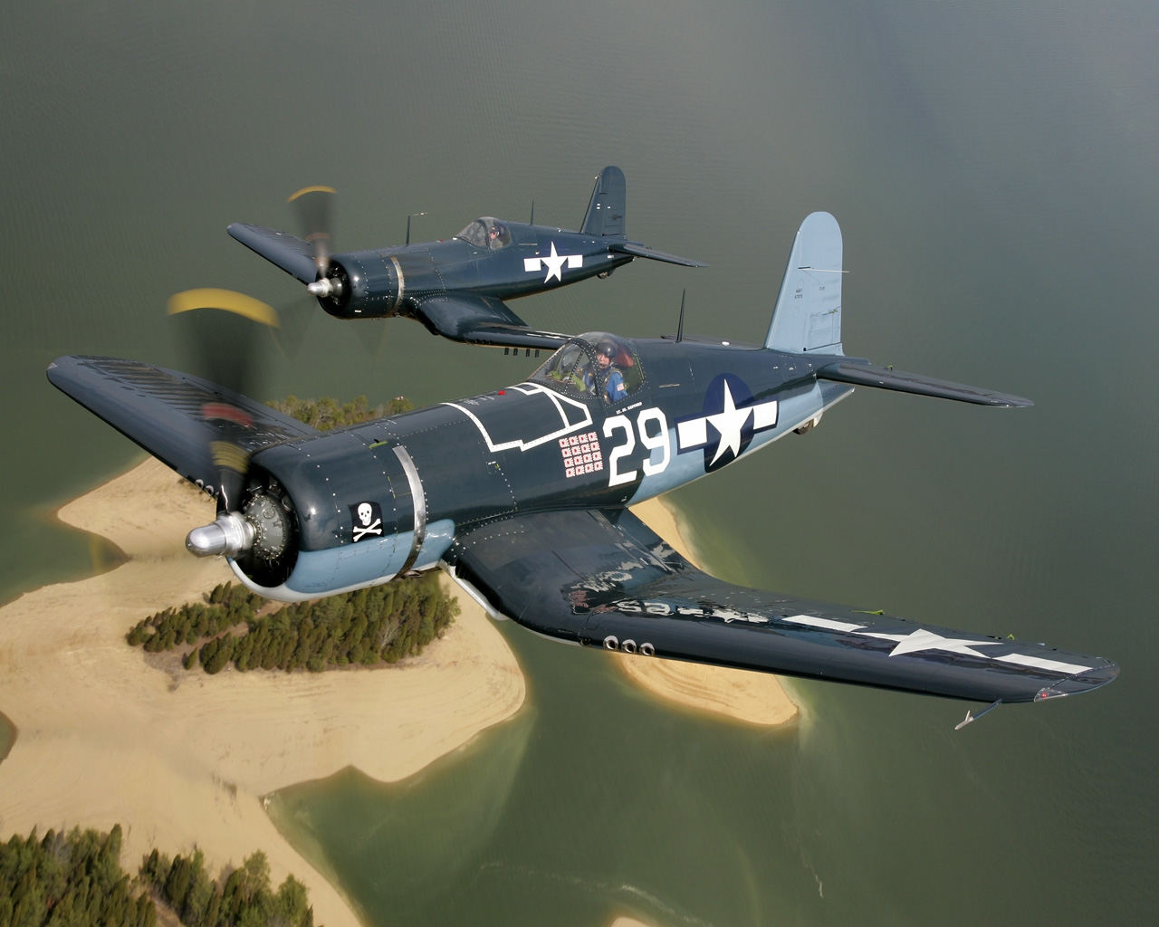 Description: Two planes flying over a small island in the water with sand and trees in the background and a body of water.