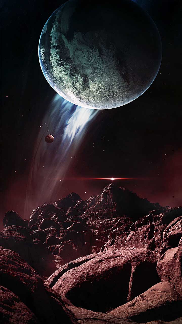 Description: A planet with a distant object in the background and a distant object in the foreground.