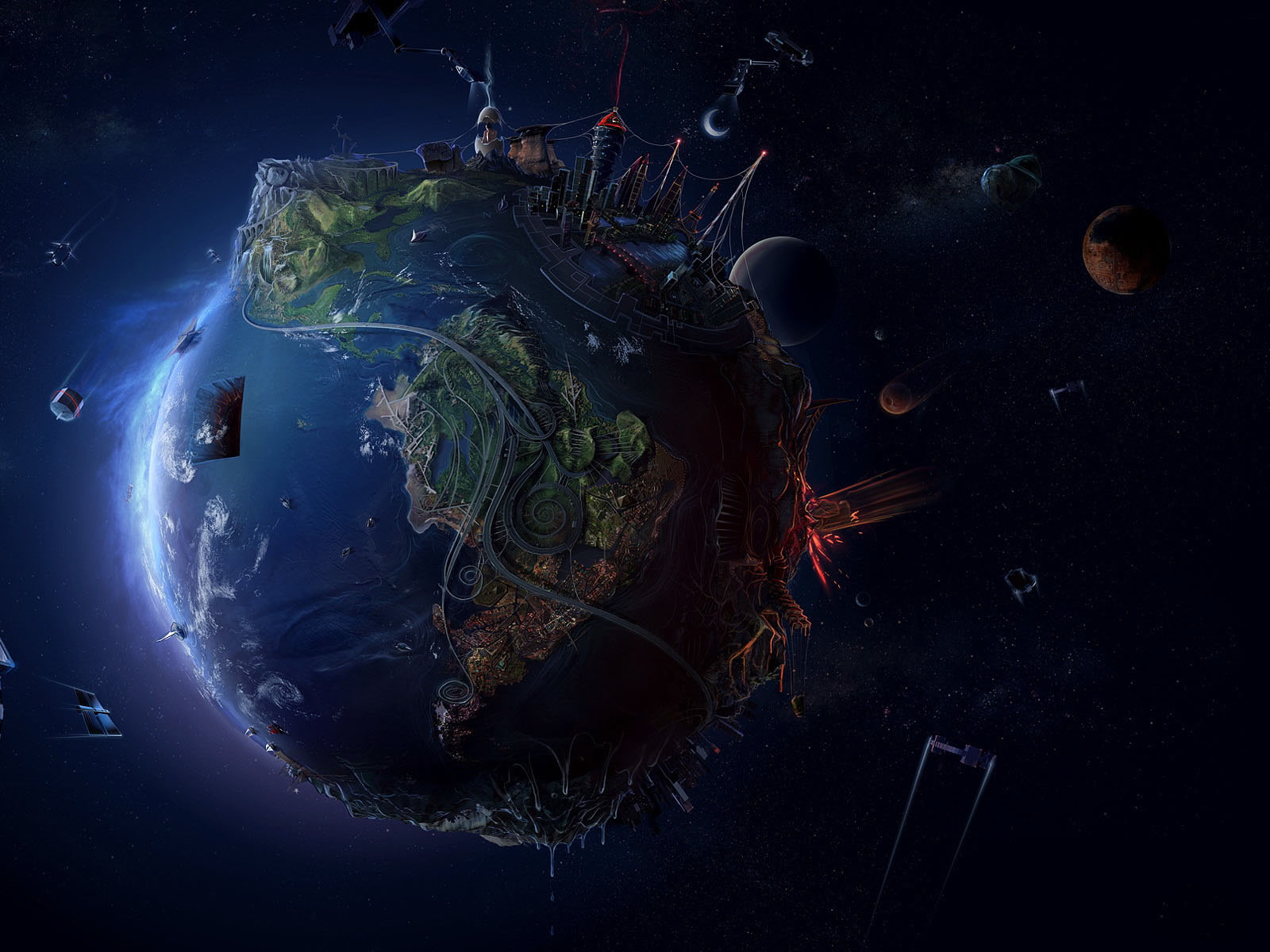 Description: A computer generated image of a planet with a lot of objects around it and a sky background with a blue glow.