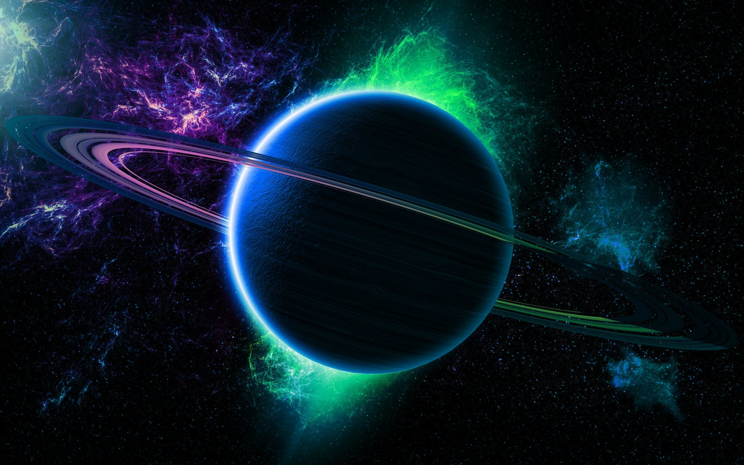 Description: A planet with a ring around it in the space with stars and dust around it.