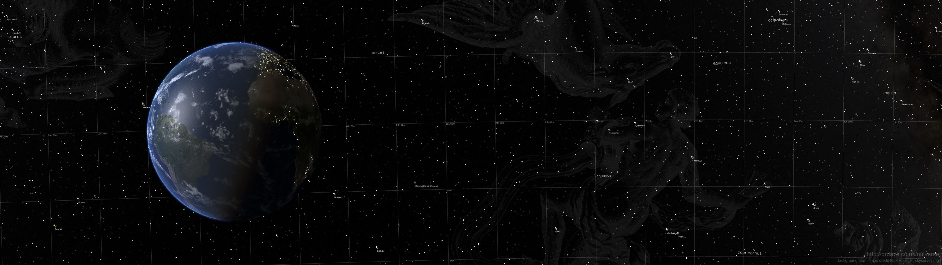 Description: A computer generated image of a planet in space with stars and lines on the surface of the image and the earth in the background.