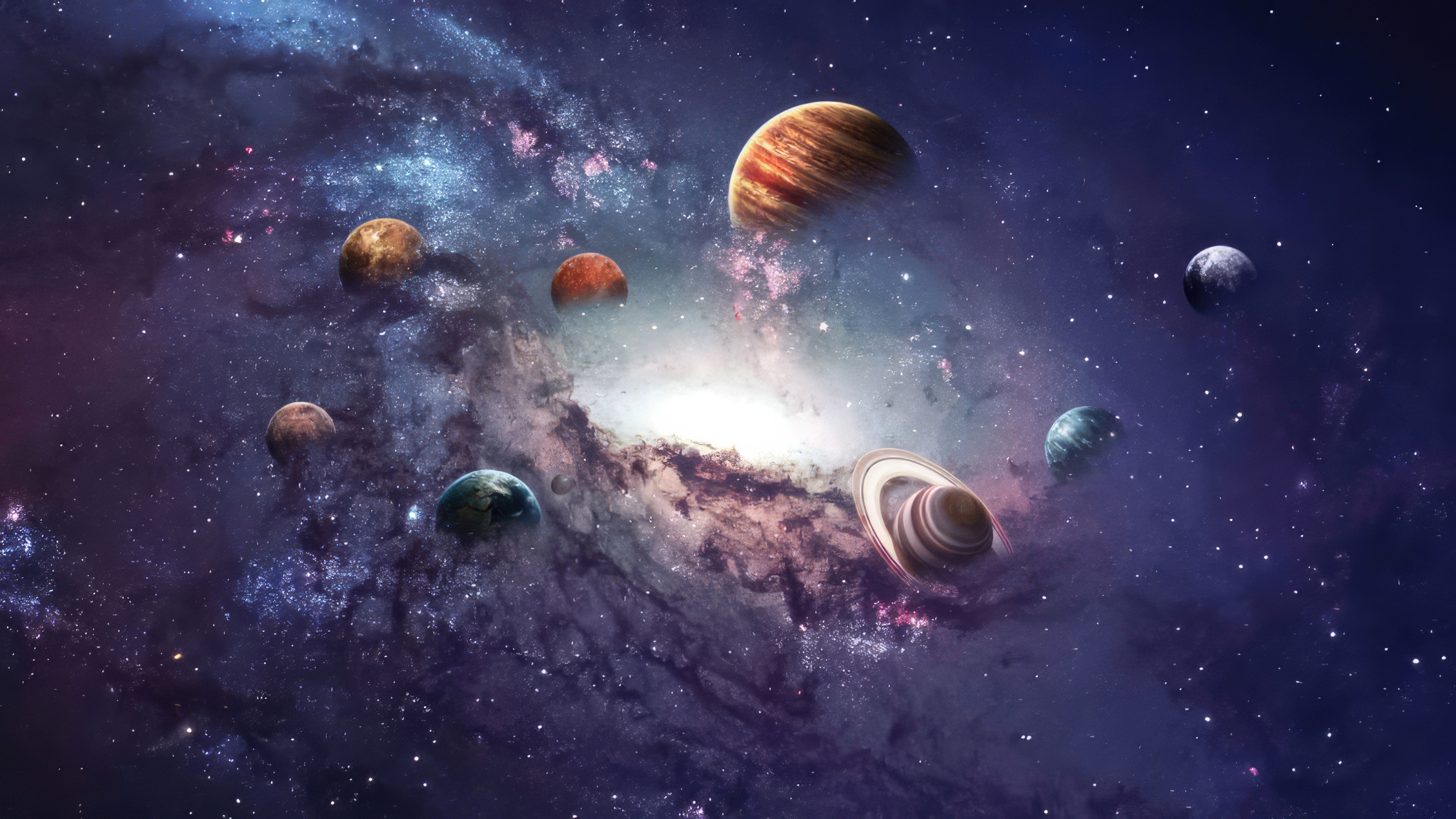 Description: A group of planets in the sky with stars around them and a bright light shining on the planets in the background.